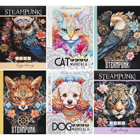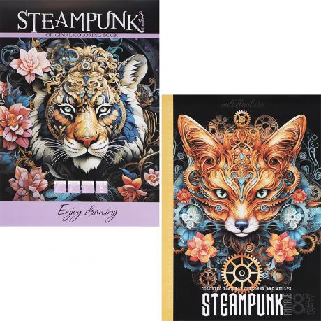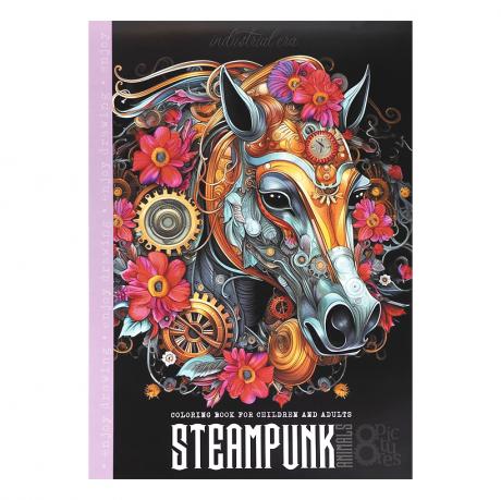 Розмальовка в стилі "Стимпанк" (напрямок наукової фантастики, що включає технологію та декоративно-ужиткове мистецтво, натхненний технологіями та фантастикою XIX століття). Розмальовка на скоби А4 297х210 мм, 120г, 8 аркушів. Друк 1+0 Альбомне відкриття догори. Картон 180 г/м2, друк 4+4. Внутрішній блок офсет 120 г/м2, друк 1+0. Один дизайн в упаковці 20шт