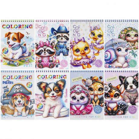 Розмальовка з наліпками на Спіралі 148 х 210 мм., 100г, 12 аркушів, друк 4+4. Комплектація-Обкладинка +внутрішній блок + аркуш з наліпками + подложка