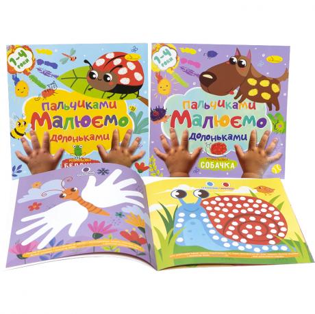На кожному малюнку є спеціальні місця, які потрібно розфарбувати пальчиками, чи долоньками, або ж і тим, і тим. А далі все просто – малюк вмочує пальчики або долоньки у пальчикові фарби, торкається сторінок та ставить відбитки у позначених місцях і розфарбовує малюнок. А долоньками можна малюнок не просто розфарбовувати, а й домальовувати та завершувати.