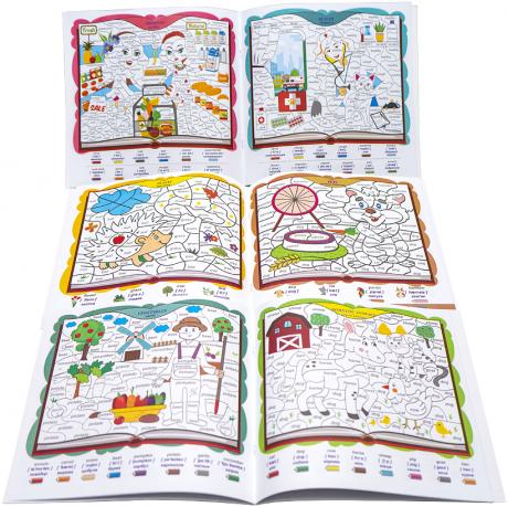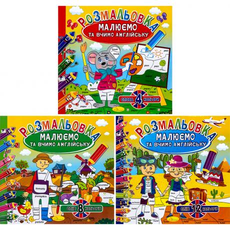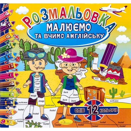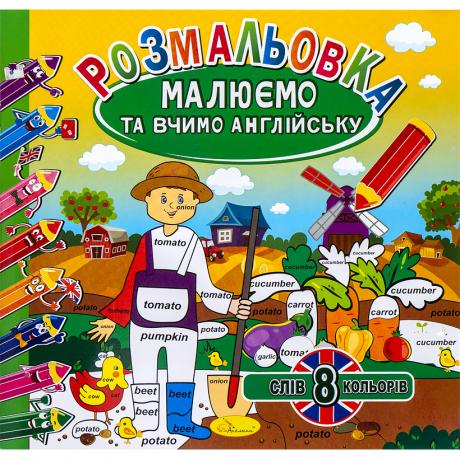 Розмальовка "Малюємо та вчимо англійську" - вчимо англійські слова, розфарбовуючи! Малюнки розбиті на частинки, де кожен колір відповідає певному англійському слову відповідної тематики. Є переклад слова та його транскрипція. 6 листів розмір 23 * 22,5см