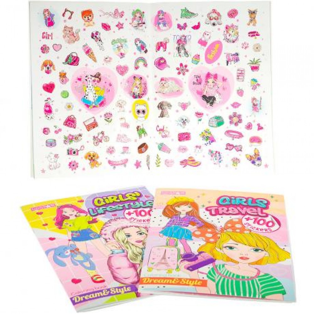 Розмальовка "Dream & Style: Girls Travel" + 100 наліпок, формат A4 (210×297 мм), 24 сторінки + 2 аркуші наліпок з рожевим неоном і глітером, обкладинка з картону 215 г/м² з неоновим друком, матовою ламінацією та глітером, скріплення на скобі, блок з офсетного паперу 100 г/м² та самоклеючого паперу, кольоровий друк, мова українська та англійська, вага 125 г, ідеально для творчих дівчат — понад 100 стильних наліпок для декору.