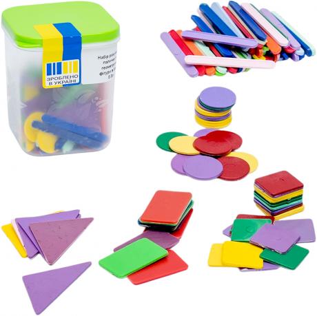 Набір містить 50 рахункових паличок, 20 кіл, 6 трикутників, 20 квадратів і 10 прямокутників. Усі елементи зберігаються в квадратному контейнері об'ємом 0,3 л. Набір підходить для навчання дітей основам математики та геометрії. Використовується в дитячих садках, школах та для занять вдома.