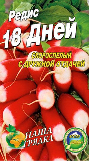 Редис 18 дней Раннеспелый сорт редиса. Корнеплоды цилиндрической формы, ярко-красные, с белым кончиком, длиной 6 — 8 см, массой 25 — 30 г. Мякоть сочная, слабо-острая, нежная, пикантная. Сорт характеризуется отменными вкусовыми качествами, относительной устойчивостью к цветушности и растрескиванию. Выращивают в открытом грунте и под пленкой. Используют в свежем виде. Посев семян в открытый грунт: начало апрель — средина август Глубина посева: 1,5 — 2 см