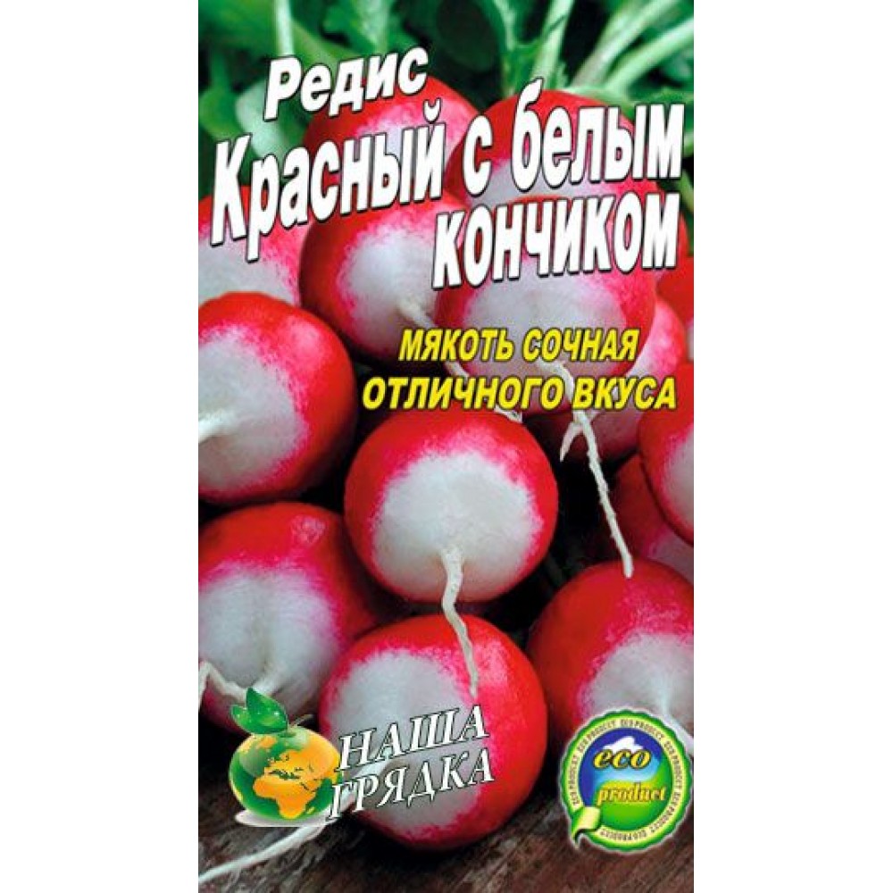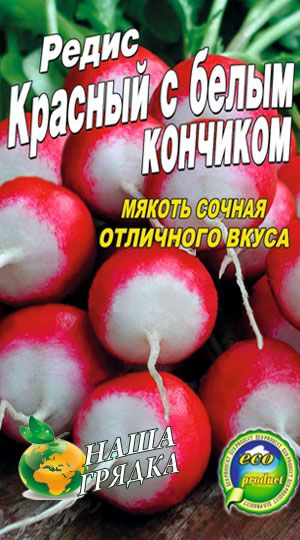 Редис "Красный с белым кончиком" Высокоурожайный сорт, среднеспелый 22-25 дней, засухоустойчивый сорт с высокими вкусовыми качествами. Мякоть белая, нежного полуострого вкуса. Рекомендуется для выращивания в открытом и закрытом грунте. Высокая эффективность возделывания обеспечивается позднелетним посевом