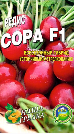 Редис Сора Скороспелый (20-22 дня) сорт крупноплодного, всесезонного редиса. Хорошо переносит пониженные температуры, поэтому отлично подходит для выращивания в пленочных теплицах ранней весной и осенью. Ботва небольшая и компактная Посев семян в открытый грунт: начало апрель — средина август Глубина посева: 1,5 — 2 см