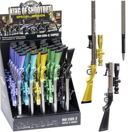 Ручка гелева. Пластиковий кольоровий корпус у формі снайперської гвинтівки, оптичний приціл - ліхтарик, товщина лінії 0,38 мм, змінний стрижень. Загальна довжина ручки 22,5 см Колір синій.