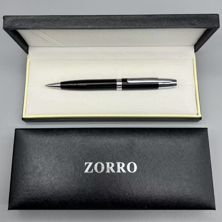 Стильная шариковая ручка ZORRO — практичный аксессуар с элегантным дизайном. Корпус выполнен в черном цвете с серебристыми металлическими элементами, которые придают модели современный и солидный вид. Ручка поставляется в фирменной подарочной коробке, что делает её отличным вариантом для личного использования и в качестве подарка.