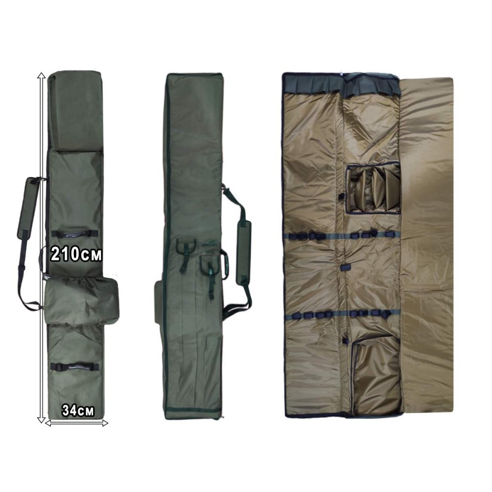 Для удобной транспортировки предусмотрены 3 ручки и рюкзак. Общая длина чехла составляй 210см, шириной он 34см, и толщиной 6см. На внешней части чехла есть два длинных кармана размером 107х10х3см и 93х10х3см для подсака, зонта или подставок.