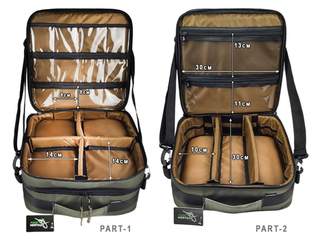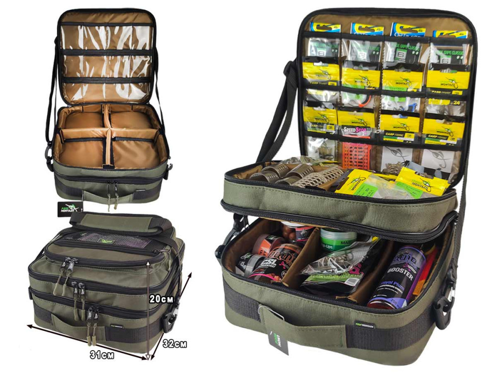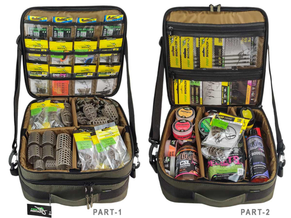 Верхний ярус сумки разделен на 4 жестких отсека, они отлично подходят для различных кормушек или грузов, каждая перегородка также надежно закреплена на 3 точках, по-этому возможное смешивание состава каждого отсека сведено к минимуму. На крышке верхнего отсека 12 прозрачных карманов, которые прекрасно подходят для крючков и различной фурнитуры.