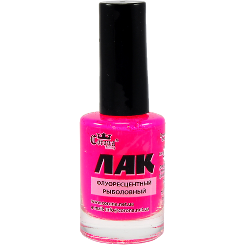 Лак рыболовный флуоресцентный Corona Рыболовный лак применяется для окраски поплавков, блесен, воблеров, мормышек и т.д. Долго сохраняет эффект флуоресцентности, стойкий к выгоранию, эластичный, влагостойкий. Не имеет запаха, не растворяет пенополистирол (пенопласт). Для усиления эффекта рекомендуется первый слой покрыть белым лаком