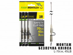 Монтаж безопасная клипса L-70см, 45lb (3шт) - изготовлен на качественном тонущем лидкоре Climax (Germany) с разрывной мощностью 45lb и длиной 70см. Цвет Camo, сливаясь с дном водоема делает его малозаметным для рыбы. Благодаря безопасной клипсе можно легко изменять тип и вес груза на протяжении рыбалки. Обычно монтаж с безопасной клипсой используют в карповой ловле в сложных условиях, при возможных зацепах груза в камнях или ветках - основная оснастка легко высвобождается и можно продолжить вываживание трофея.