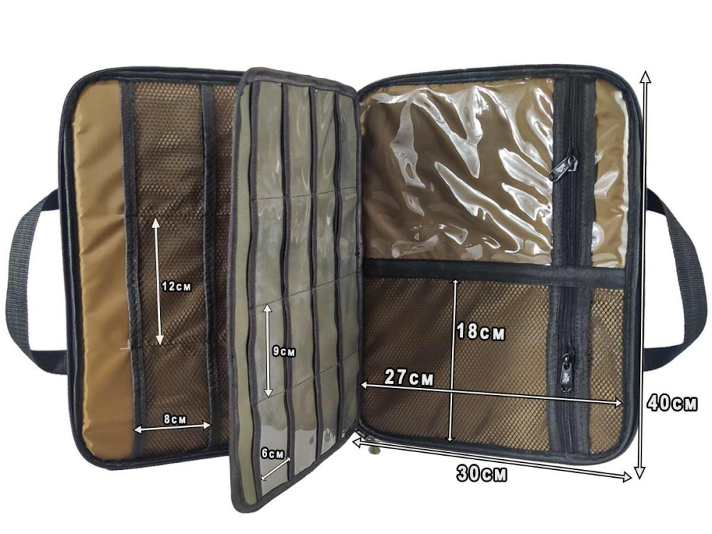 Сумка порадует владельца продуманной эргономикой. Снаружи сумки есть большой карман на сетке, его размер: 38х19см. Открывая органайзер мы видим 2 больших кармана размером 18х27см, один прозрачный из пвх, другой на сетке. Средняя перегородка специально разработана для хранения небольших упаковок с крючками или фурнитурой, размер каждого кармана на первой стороне составляет: 6х9см, еще 8 таких карманов на второй стороне, а также дополнительно предусмотрено 4 большие карманы размером 18х6см. На последнем развороте 9 сетчатых карманов размером 12х8см, они хорошо подходят для хранения лесок, поводкового материала, различных лидкоров и.т.д. Для удобства переноски сумка оснащена ручкой.