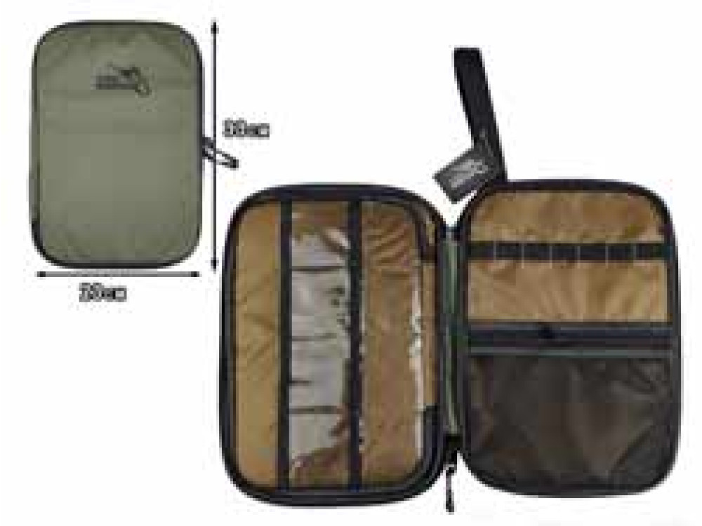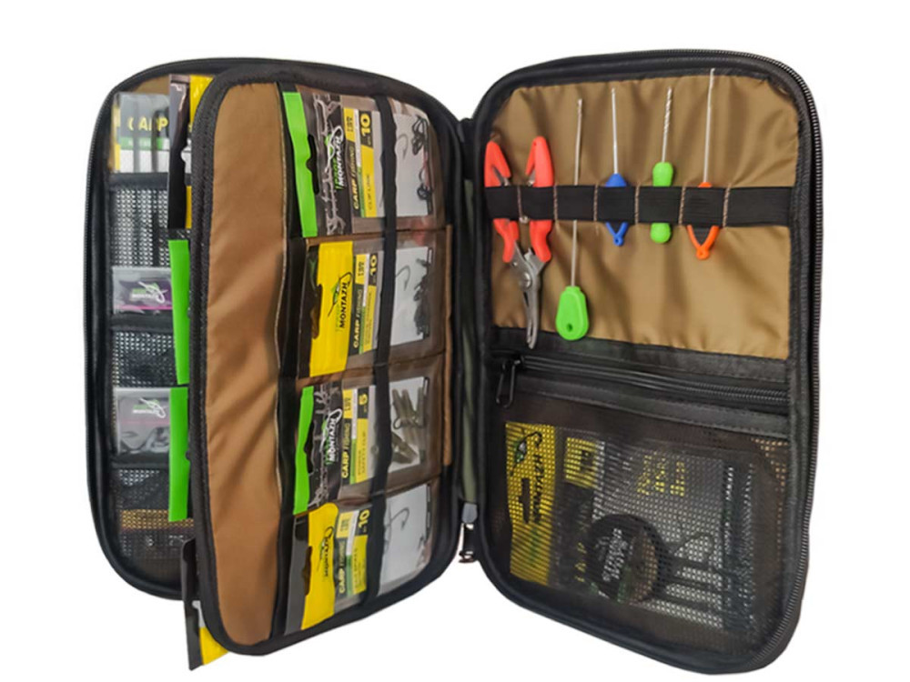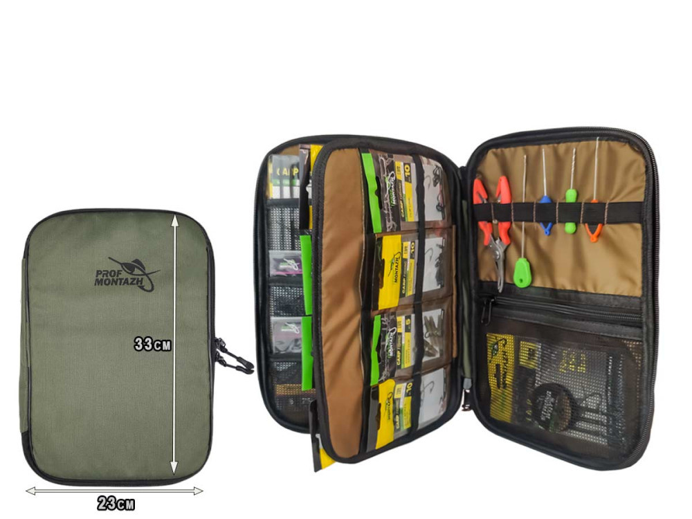 Такая сумка-органайзер прекрасно подходит для хранения и транспортировки на рыбалку: крючков, разнообразной фурнитуры, необходимого инструмента и аксессуаров. Сумка порадует владельца продуманной эргономикой. Средняя перегородка специально разработана для хранения небольших пакетиков с крючками или фурнитурой размер каждого кармана составляет: 7х7см. Всего таких прозрачных карманов 16 штук. 6 сетчатых карманов размером 10х9см хорошо подходят для хранения лесок, поводкового материала, различных лидкоров и.т.д. Последний разворот органайзера имеет большой и вместительный карман на молнии: размером 20х14см. Наверху под стропой удобно хранить разнообразный рыболовный инструмент. На обороте органайзера предусмотрен большой карман 21х20см, и для удобства переноски: ручка-пояс.