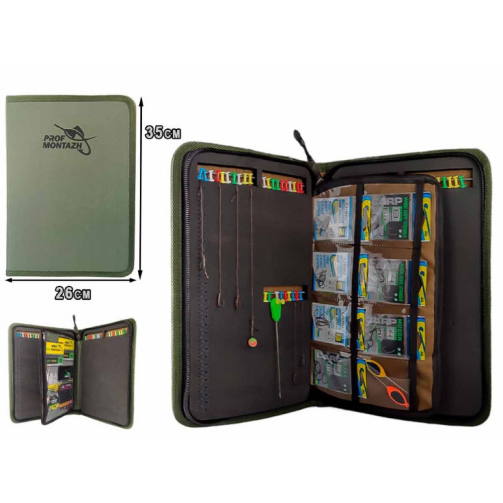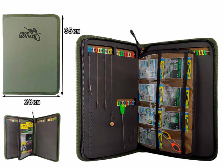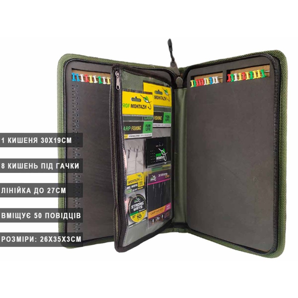 Поводочница RIG-BOX BIG на 50 поводков (Khaki) - изготовлена из качественных и надежных материалов. Внешняя ткань практичный водоотталкивающий Oxford. Внутренние планшеты выполнены из плотного EVA материала. На левой планшетке для поводков нанесена линейка до 27см. Для фиксации поводка предусмотрены специальные булавки и штанга. Поводочница RIG-BOX BIG легко вмещает до 50 готовых поводков. Для придания жесткости внутри поводочницы установлены пластины. Предусмотрен дополнительный внутренний отсек на 8 карманов для крючков с одной стороны и на 1 большой карман размером 30х19см для акссесуаров, лидкоров и другой фурнитуры с другой стороны. Такая поводочница идеально подойдет для хранения и транспортировки готовых поводков для карповой ловли.
