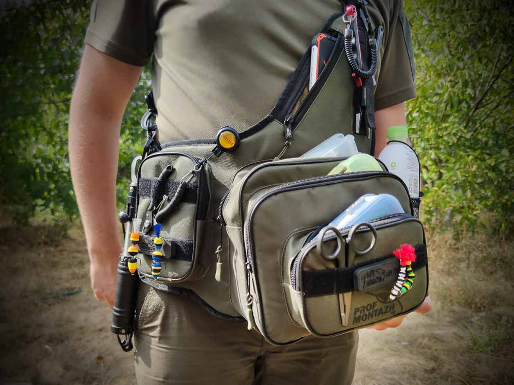 Сумка изготовлена из плотной ткани OxFord 600D с внутренней ПВХ накаткой, которая предотвращает промокание сумки. Внешняя ткань легко поддается чистке и отличается прочностью. Сумка насчитывает 4 кармана для коробок с приманками, дополнительно в 2 больших карманах предусмотрены внутренний отсек для разнообразной мелочевки. На двух внешних карманах предусмотрены специальные крепления для инструмента и приманок. Сумка имеет 2 системы крепления поясную и плечевую. За счет чего происходит разгрузка спины, поэтому рыбак может с легкостью рыбачить целый день не чувствуя усталости;