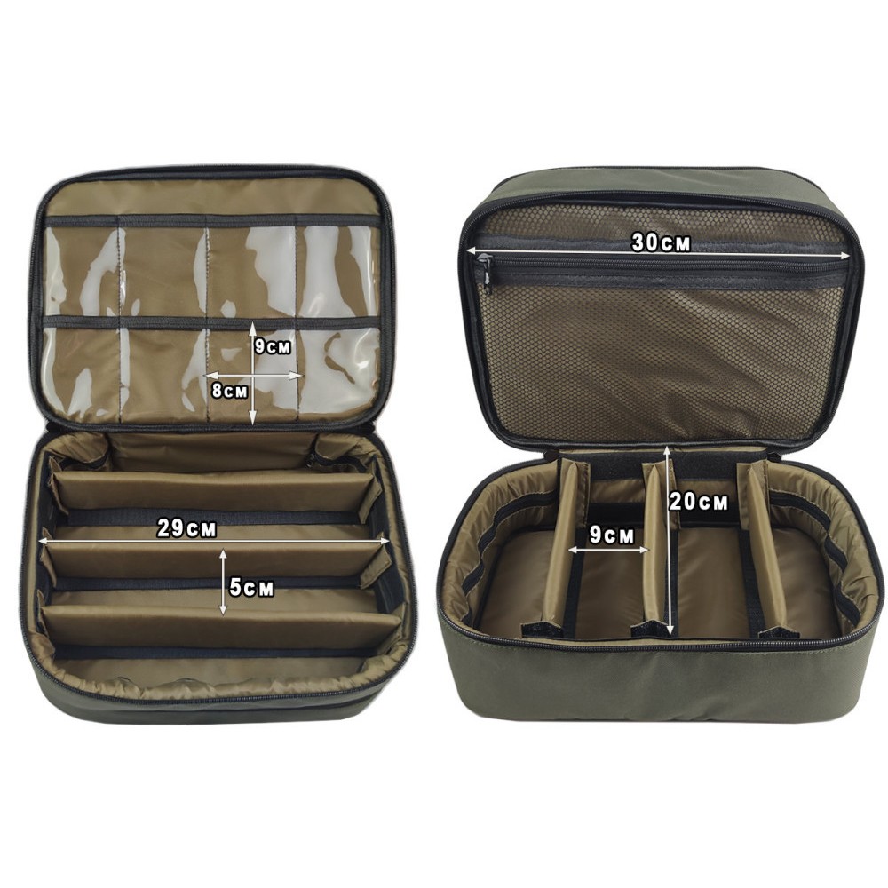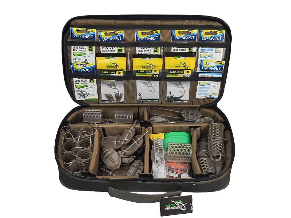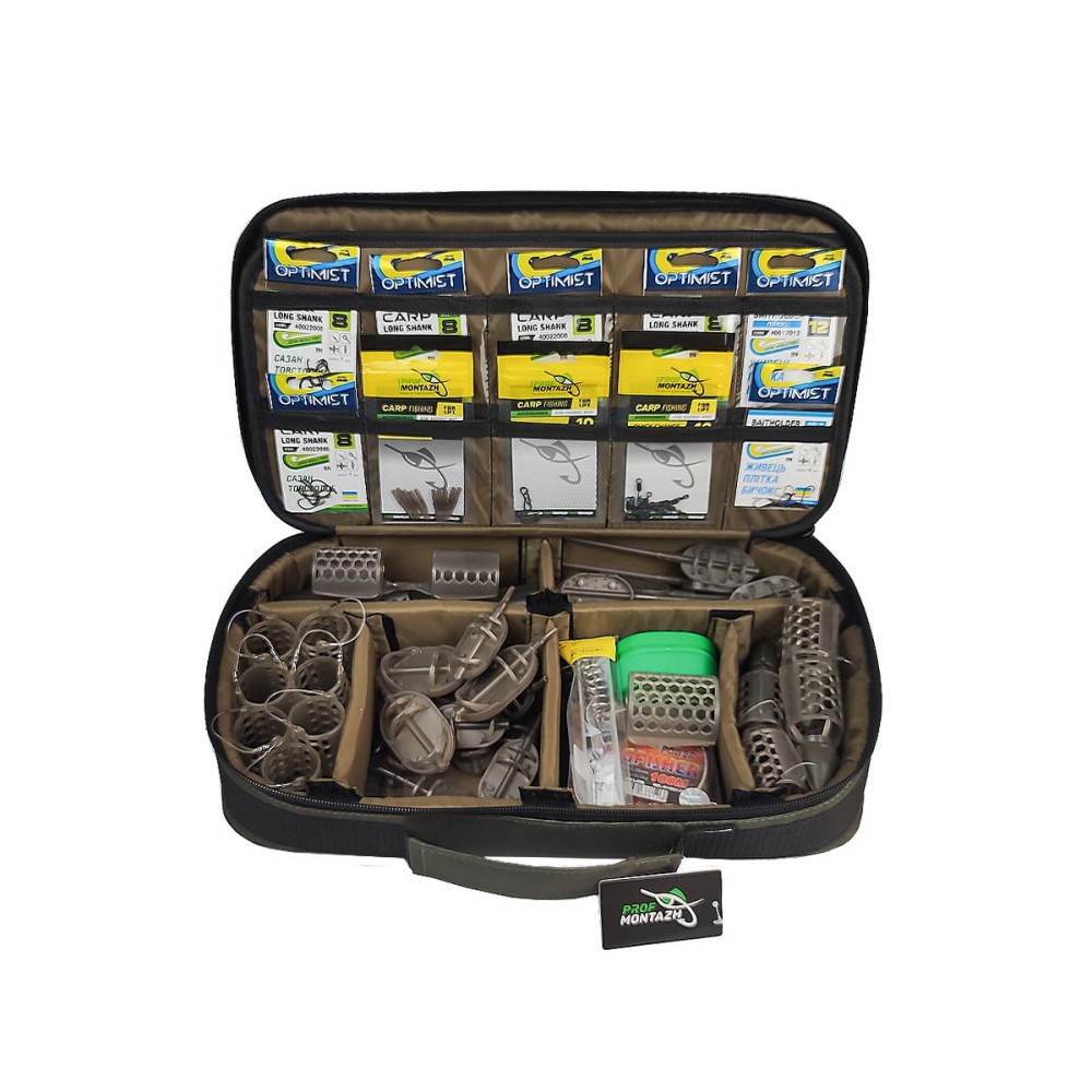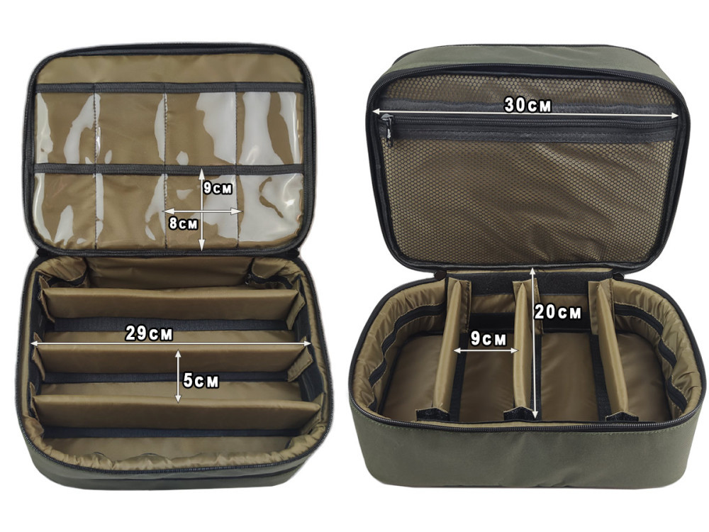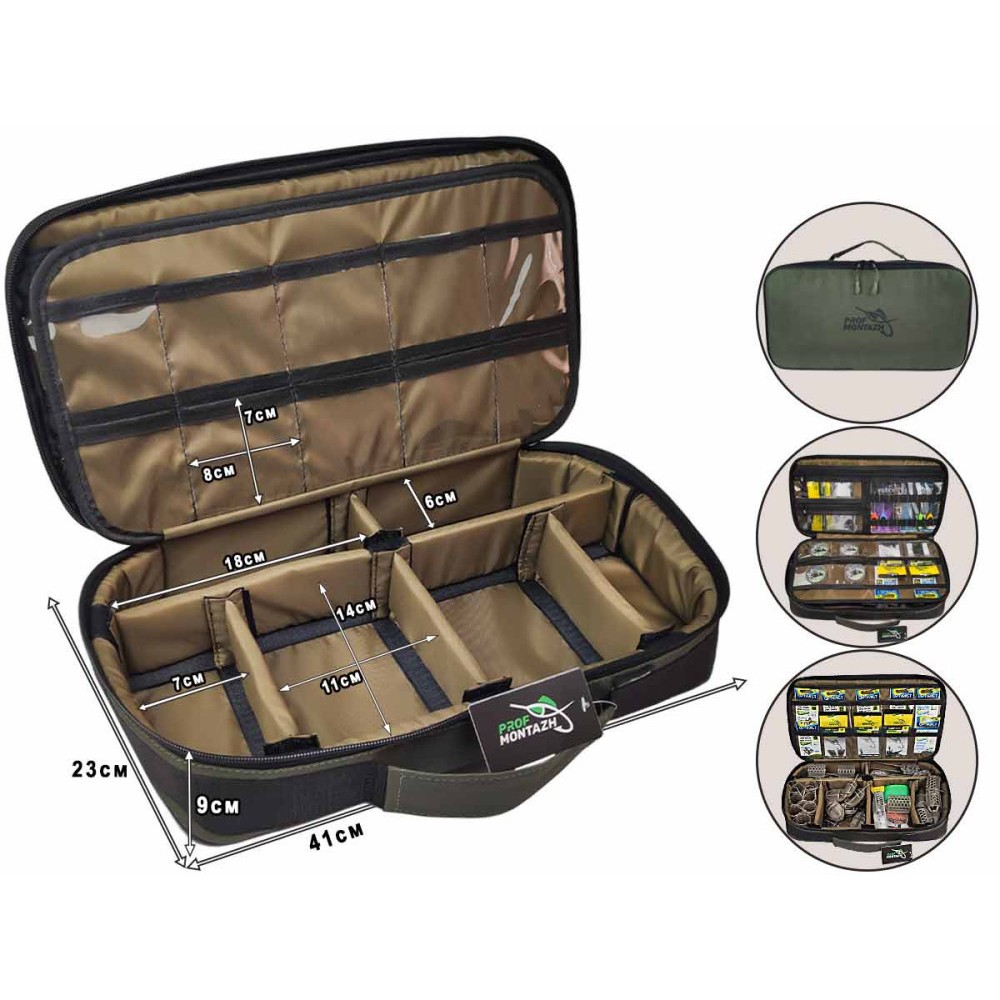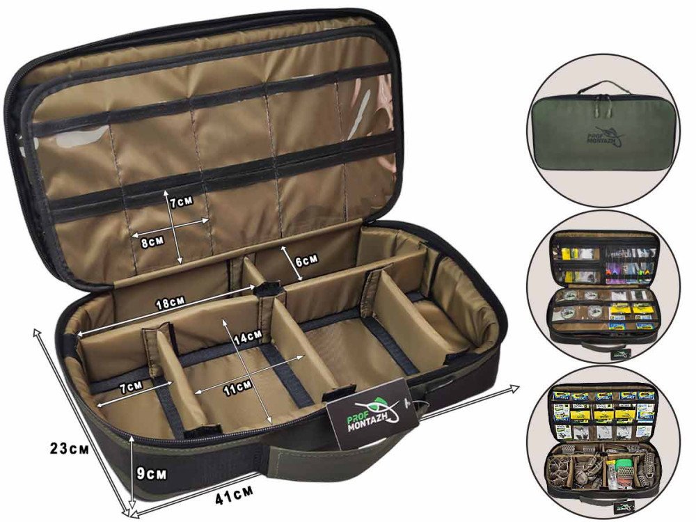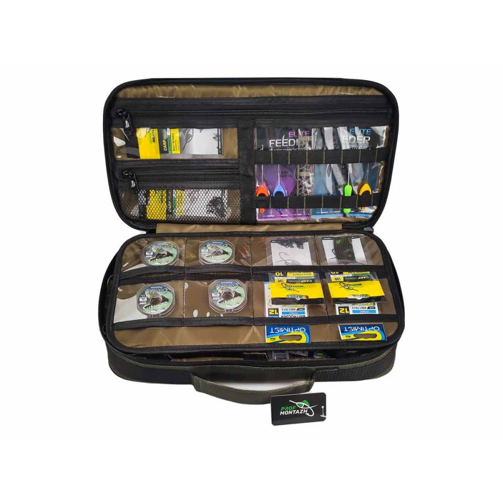 Сумка-органайзер Tackle Bag FFC - это универсальная сумка, она отлично подходит для аксессуаров и кормушек в фидерной ловле, флет кормушек и монтажей во flat-фидере, или для поплавочной ловли. В нижней части сумки разместились 6 отсеков, каждая перегородка отсека имеет 3 точки крепления поэтому вы можете быть уверены, состав каждого отсека не перемешается друг с другом. Средняя часть выполнена на жестком водостойком картоне и насчитывает 18 прозрачных карманов для крючков, фурнитуры или поводочной лески. На верхней крышке предусмотрены 2 средних кармана, 1 большой и крепление для инструмента.