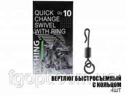 Вертлюг быстросъемный с кольцом (10шт) - используется в монтажах типа helicopter rig, chod rig, ronnie rig, шарнирное соединение предотвращает перекручивание и добавляет подвижности поводку для натуральной презентации насадки на дне. Вертлюг из быстросьемом позволяет легко и быстро изменять поводок. Изготовляется из высококачественной упругой стали, имеет PTFE защиту от ржавления и матовый цвет для лучшей маскировки.