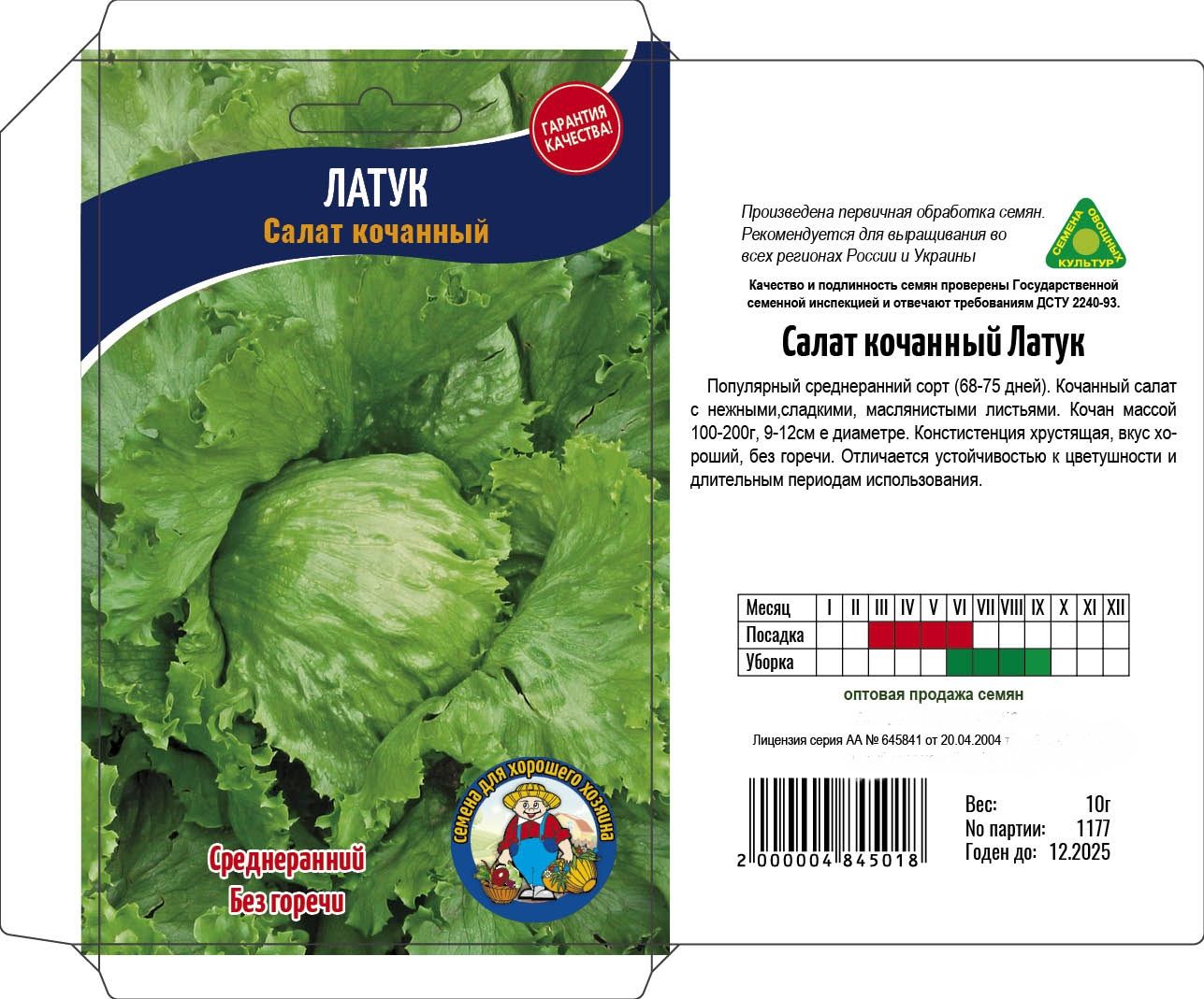 Популярный среднеранний сорт (68-75 дней). Кочанный салат с нежными,сладкими, маслянистыми листьями. Кочан массой 100-200г, 9-12см в диаметре. Констистенция хрустящая, вкус хороший, без горечи. Отличается устойчивостью к цветушности и длительным периодам использования.