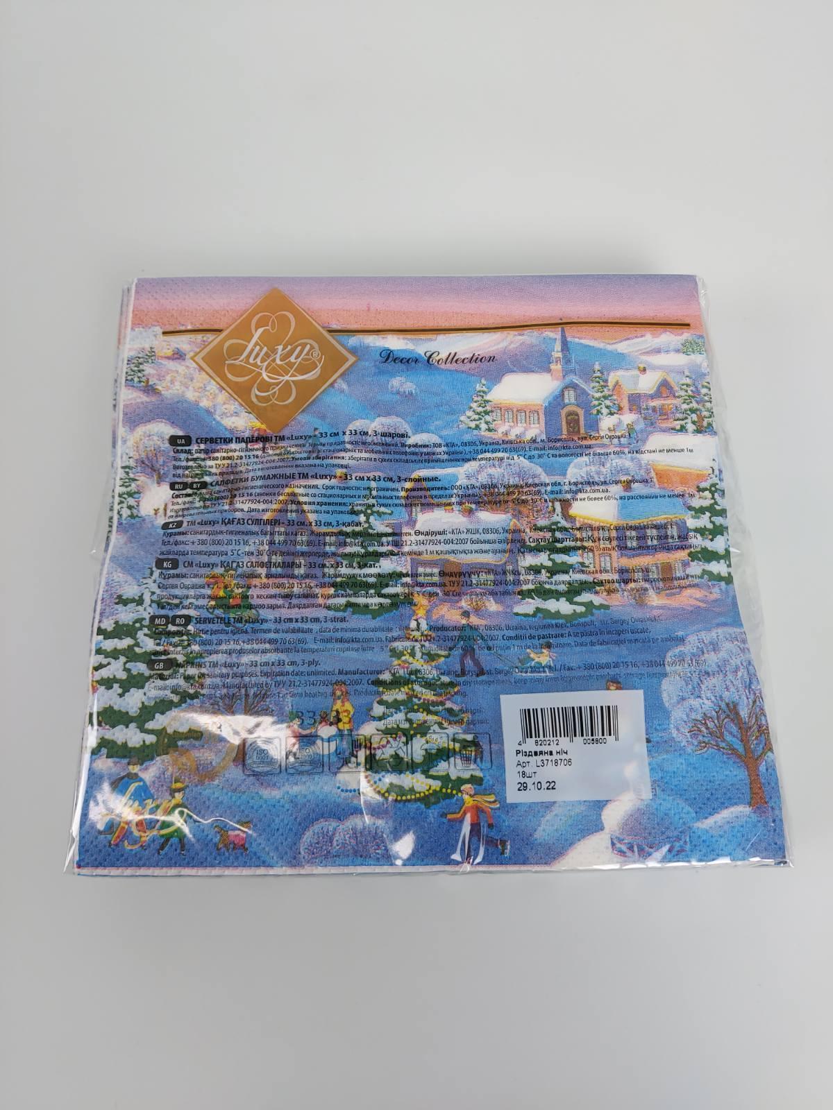 Салфетки бумажнае новогодние(ЗЗхЗЗ, 18шт)"Рождественская ночь " Luxy (1 пачка)