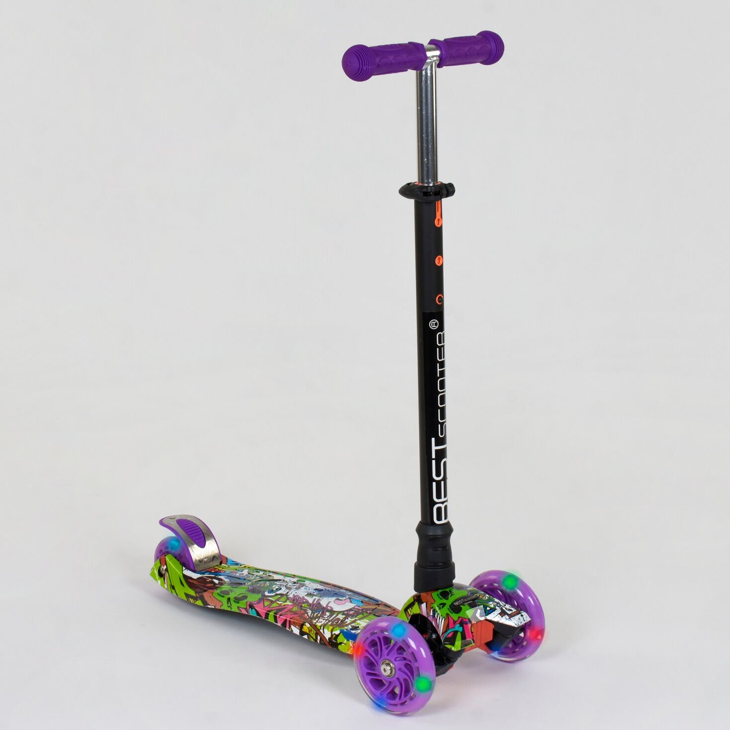 Трехколесный самокат со светящимися колесами от “Best Scooter” предназначен для маленьких любителей активного отдыха. Яркий дизайн данной модели с первого взгляда привлечет внимание малыша и станет любимым транспортным средством! За счет трехколесной конструкции и сдвоенному заднему колесу самокат достаточно устойчив и предотвращает падения во время катания. Пластмассовая дека самоката выполнена из прочного материала и крепится на раму. Т-образный руль имеет прочное металлическое основание. Высота руля фиксируется в 3х положениях. Фигурные грипсы выполнены из резины с рельефными узорами, которые предотвращают соскальзывание ладони с руля во время катания. Наклонная система поворота руля обеспечивает максимально легкое и безопасное управления самокатом. Особенности модели: - яркий и стильный дизайн; - светящиеся колеса; - регулировка высоты руля; - наклонная система поворота руля; - резиновые грипсы; - ножной тормоз на заднем колесе; Характеристики: - полиуретановые колеса; - ширина руля – 26 см; - высота руля регулируется от 77 см до 86 см, с фиксацией в 3х положениях; - размер деки – 55 х 13 см; - размеры колес: передние колеса: диаметр -12см, ширина – 2.4 см; задние колеса: диаметр - 8 см, диаметр – 2.4 см; Материалы: Руль – алюминий; Дека – пластик; Колеса - полиуретан (PU). Подробнее: https://igrushki7.ua/ru/product_info.php?info=p74317