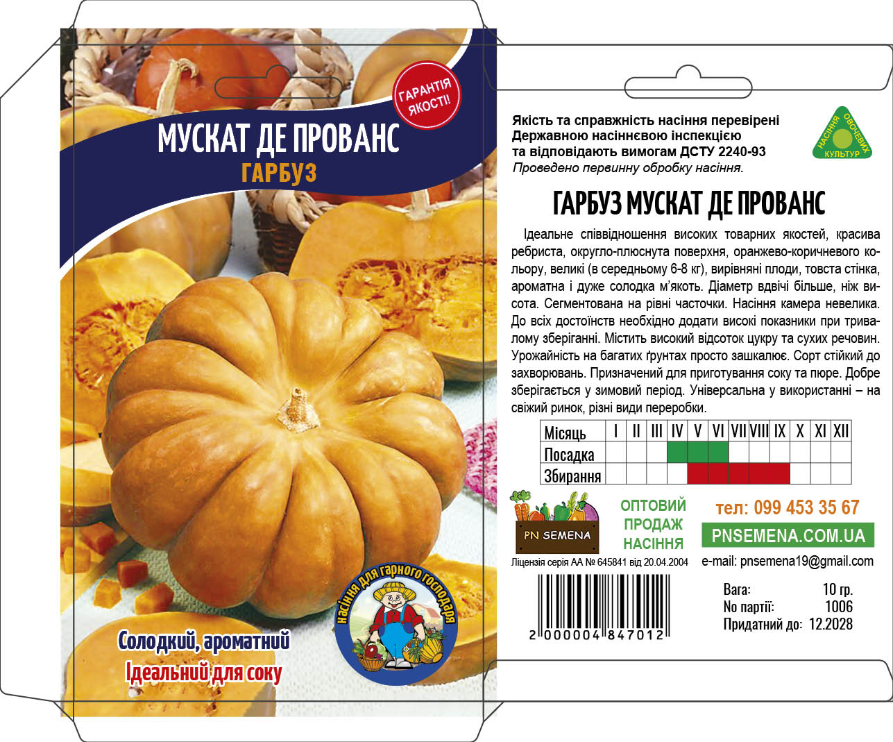 Насіння у пакеті 10 шт. Високоврожайний, середньостиглий сорт з підвищеним вмістом каротину та цукру. Вегетаційний період становить 110-115 днів. Рослина потужна, формує плоди червоно-жовтогарячого кольору, округло-плескаті, з сегментованою поверхнею, вагою 5-8 кг. М’якуш яскраво помаранчевий, щільний, з високим вмістом цукру. Смакові якості чудові.