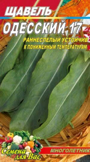 Щавель Одесский 17 Сорт раннеспелый. Период вегетации от всходов до начала массовой срезки 40-45 дней. Розетка приподнятая, раскидистая. Лист удлиненно-овальный формы, зеленый, слегка пузырчатый. Длина пластинки 12-16см, ширина 5-8см, длина черешка 11-18см. Сорт зимостойкий и засухоустойчивый. Растение влаголюбивое, хорошо выносит затенение. На одном месте щавель даёт высокие урожаи в течение 3-4 лет, затем посадки нуждаются в обновлении.