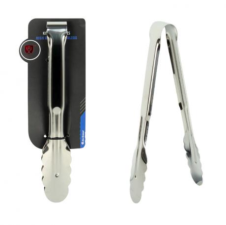 Кухонні щипці довжиною 25 см — зручний та універсальний аксесуар для приготування й подачі гарячих і холодних страв. Виготовлені з якісних термостійких матеріалів, не пошкоджують покриття посуду. Ергономічна форма з пружинним механізмом і рельєфними вставками забезпечує комфортне та надійне захоплення. Ідеальні для гриля, салатів, пасти та інших страв.Упаковка: блістер + пакет.