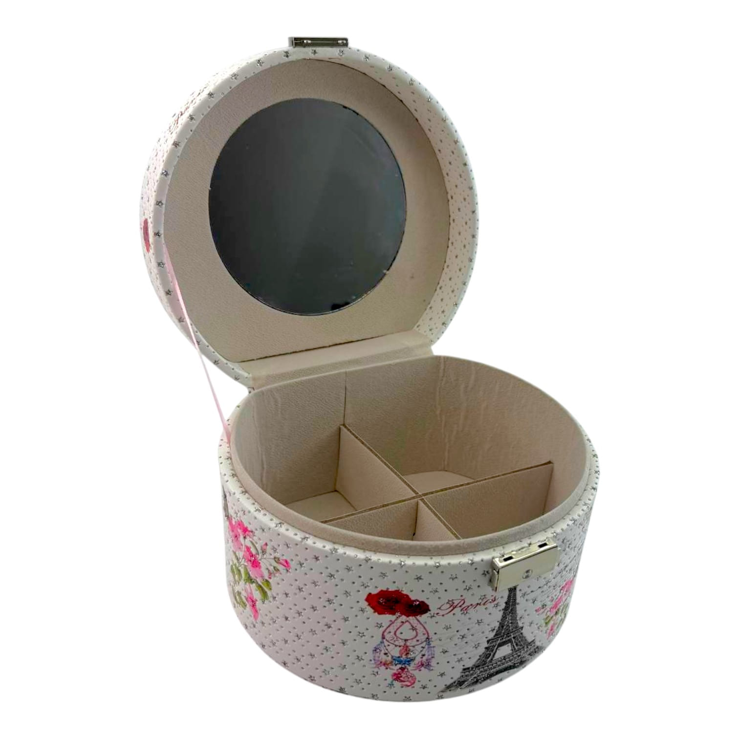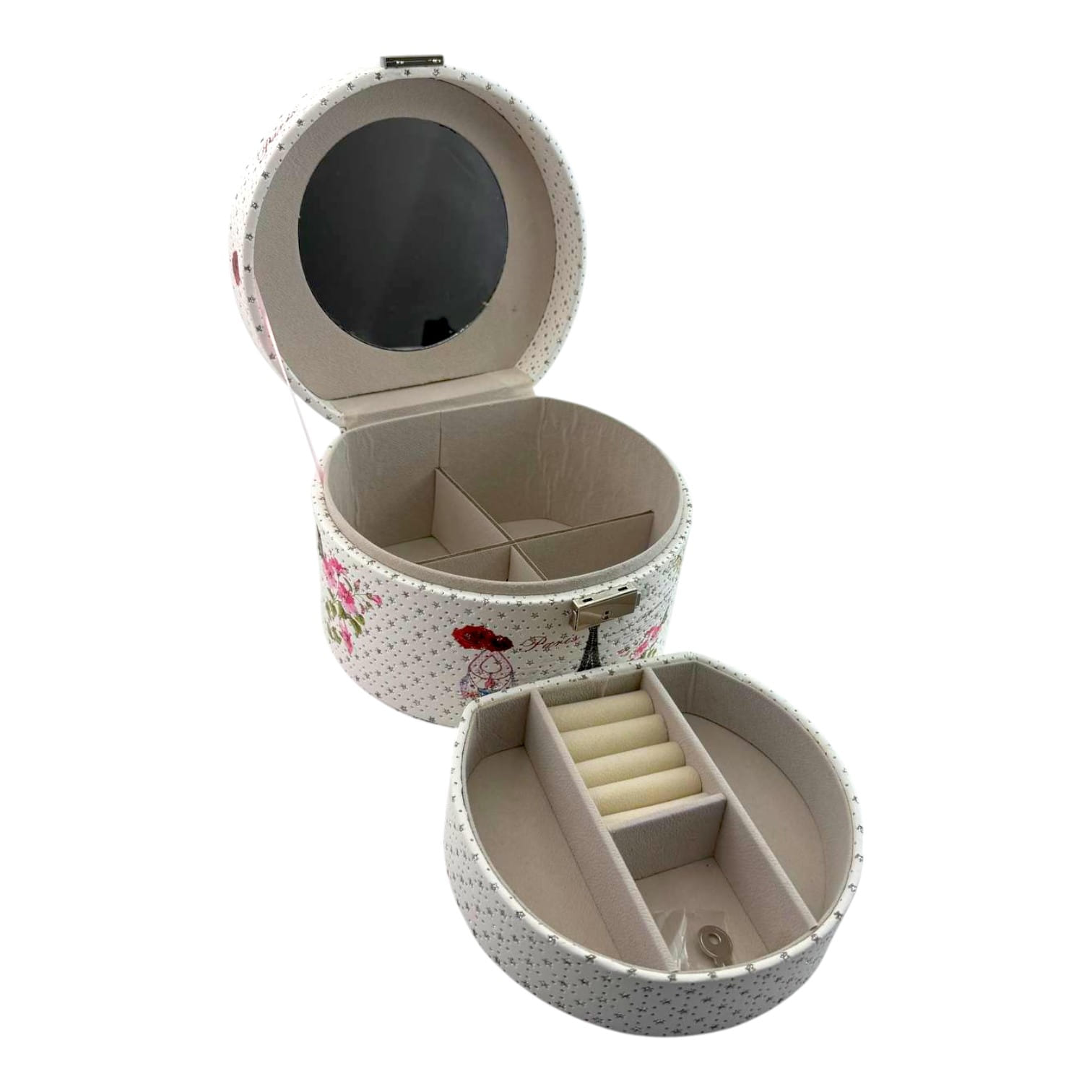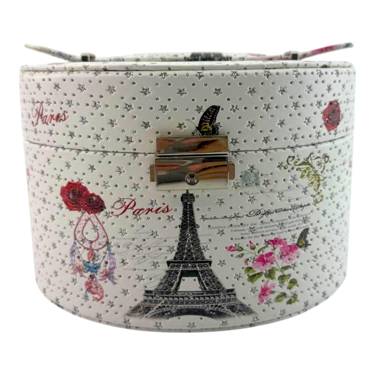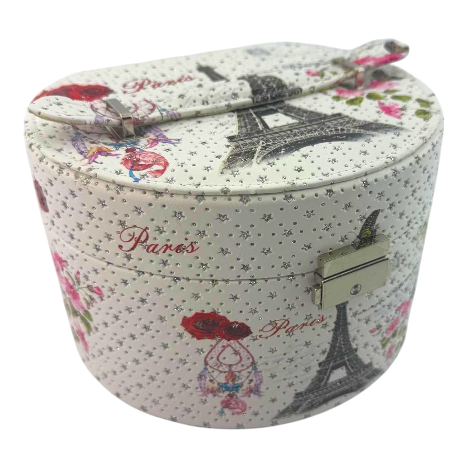 Погрузитесь в атмосферу романтичного Парижа с этой стильной шкатулкой для украшений. Овальная форма, декоративный принт с Эйфелевой башней, цветами и бабочками создают изысканный и утончённый образ. Лаконичный замочек добавляет практичности и завершённости дизайну.