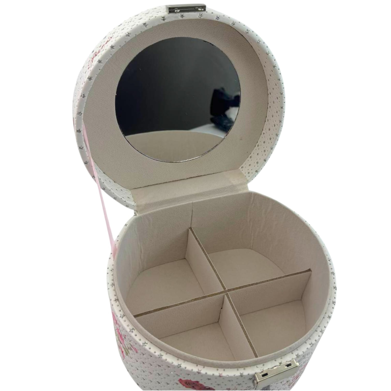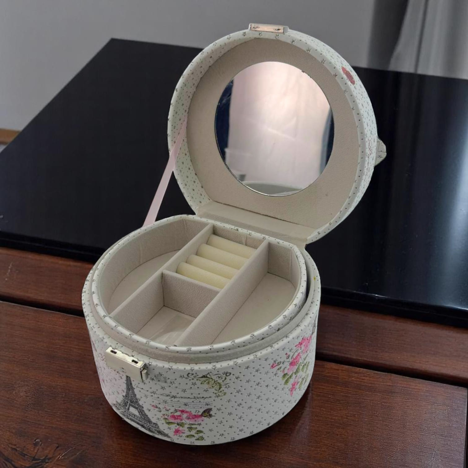 Внутри — продуманная система хранения: удобные раздвижные секции позволяют аккуратно разместить кольца, серьги, цепочки и другие аксессуары. Благодаря компактному размеру и удобной ручке шкатулку легко брать с собой в поездки.