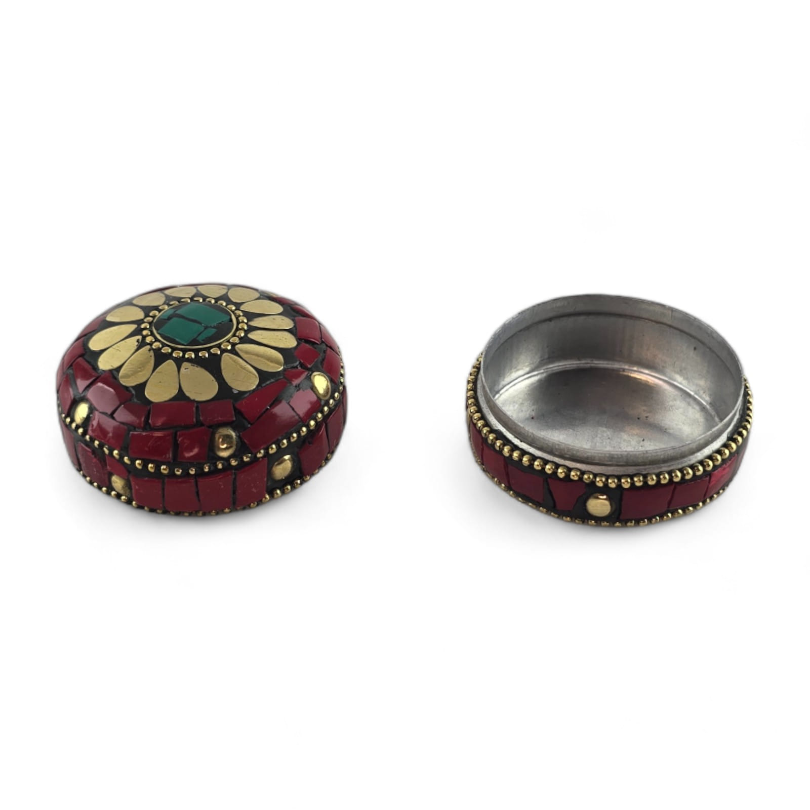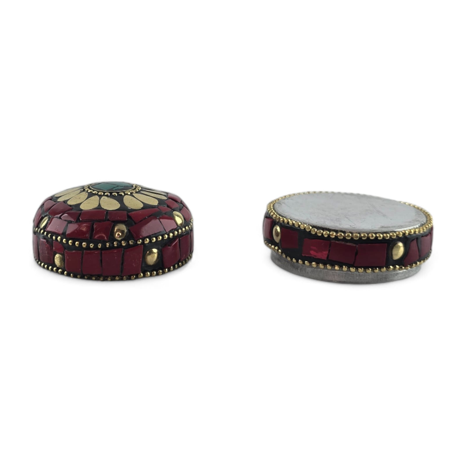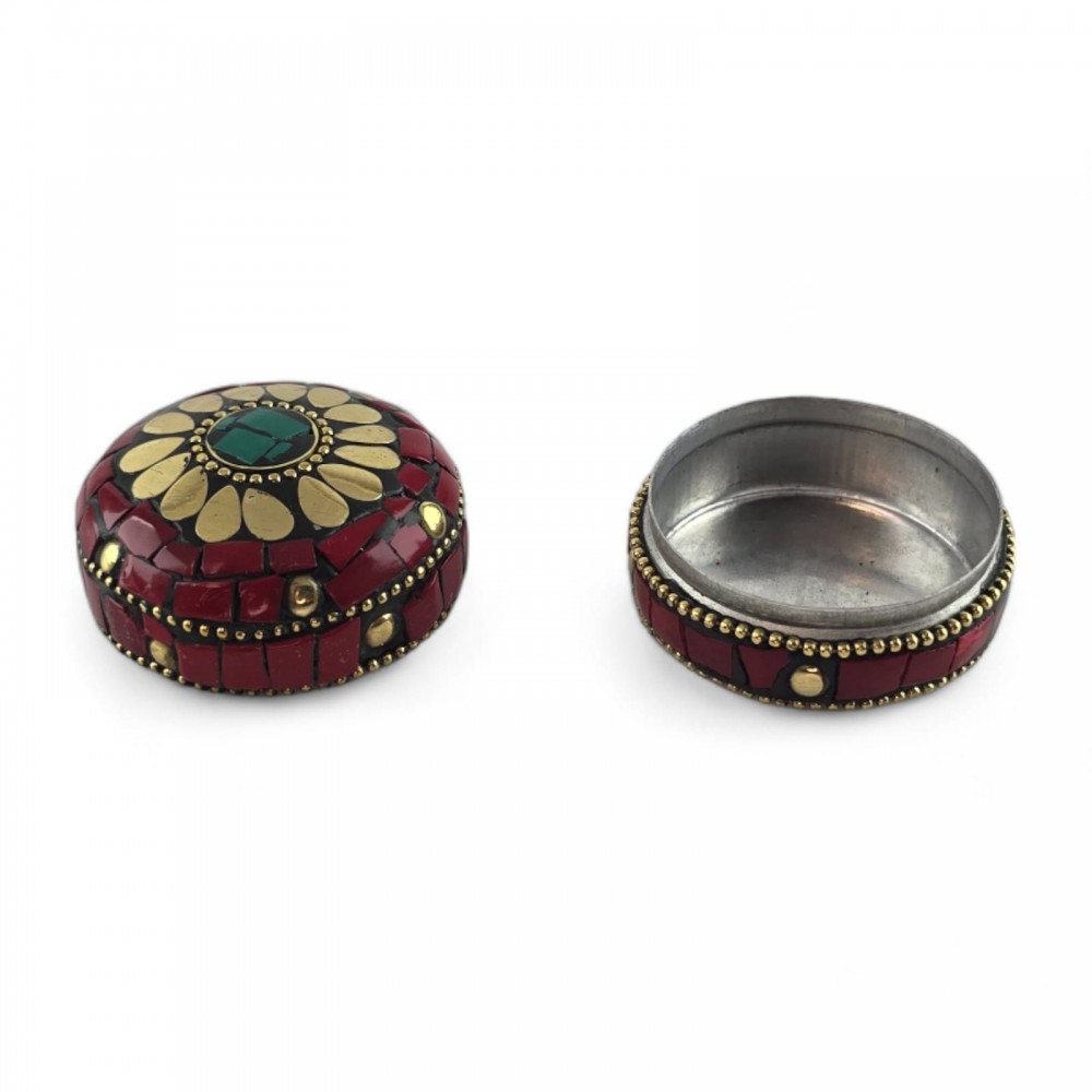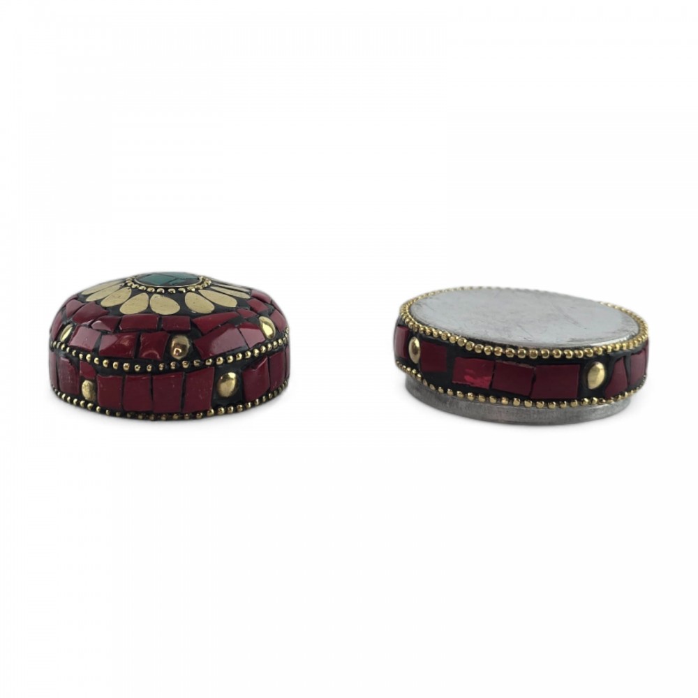 Шкатулка металлическая с кораллами и бирюзой ( h-3,2; d-4,7 см)