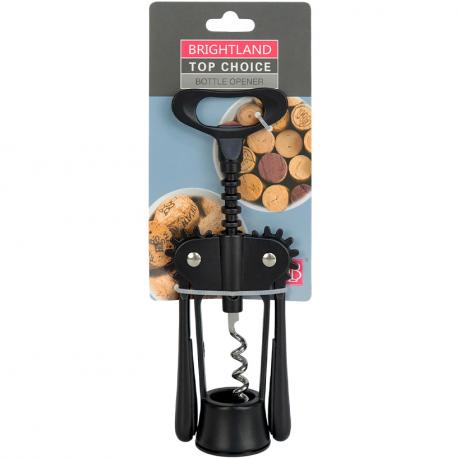 Штопор з подвійним важелем, розміром 20 см. Має неслизькі ручки для зручності використання. Упакований у блістер. Виготовлений з металу.