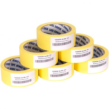 Малярний скотч має довжину 30 метрів, товщину 50 мкм і ширину 45 мм. Ціна вказана за одну бобіну. Упаковка містить 6 бобін. Мінімальне замовлення – одна упаковка (6 бобін). Фактична намотка складає 24 метри.