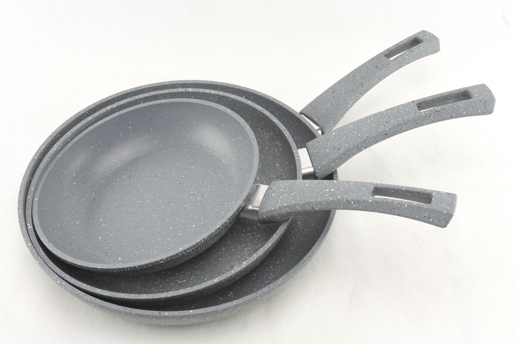 Все сковороды изготовлены из качественного литого алюминия, который характеризуется высокой теплопроводностью и имеет трехслойное покрытие из мраморной крошки. Такая поверхность данного товара обеспечивает высокую прочность и долговечность и является антипригарной. Экологически чистое и безопасное покрытие значительно улучшает качество приготовленной еды, т.к. позволяет практически не использовать жиров. Эта посуда приспособлена для приготовления на всех современных типах плит, а также индукционных. С помощью удобной эргономичной ручки из термопрочного пластика и небольшому весу, сковороды можно безопасно переносить. Ручка не нагревается и не деформируется. Посуда легко моется в теплой воде, а также в посудомоечной машине. В наборе 3 сковороды различных размеров.