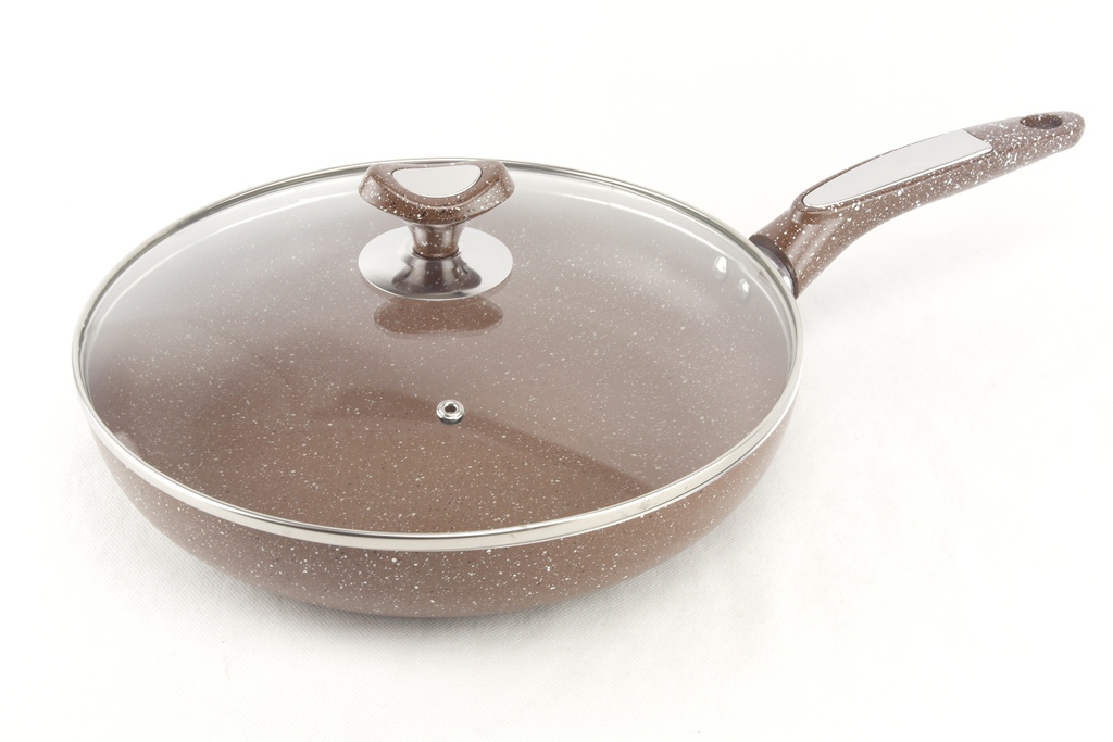 Сковорода виготовлена з високоякісного литого алюмінію, який характеризується високою теплопровідністю і має антипригарне тефлонове покриття - екологічно придатне для термічної обробки їжі. Поверхні даного товару не містять шкідливі речовини. Тефлонове покриття значно зменшує витрати на дороге масло для смаження. Пристосована для приготування на всіх сучасних типах плит. За допомогою зручної ручки сковороду легко і безпечно переміщати в процесі використання. Ручка сковороди виготовлена з термостійкого пластика. Ручка не нагрівається і не деформується. Скляна кришка має нержавіючий ободок, що перешкоджає відколу скла, отвір для відведення утворюється пара і ергономічну пластикову ручку. Сковорода легко миється в теплій воді. У даній сковороді можна смажити, тушкувати, пропарювати овочі, м'ясо, рибу і т.д.