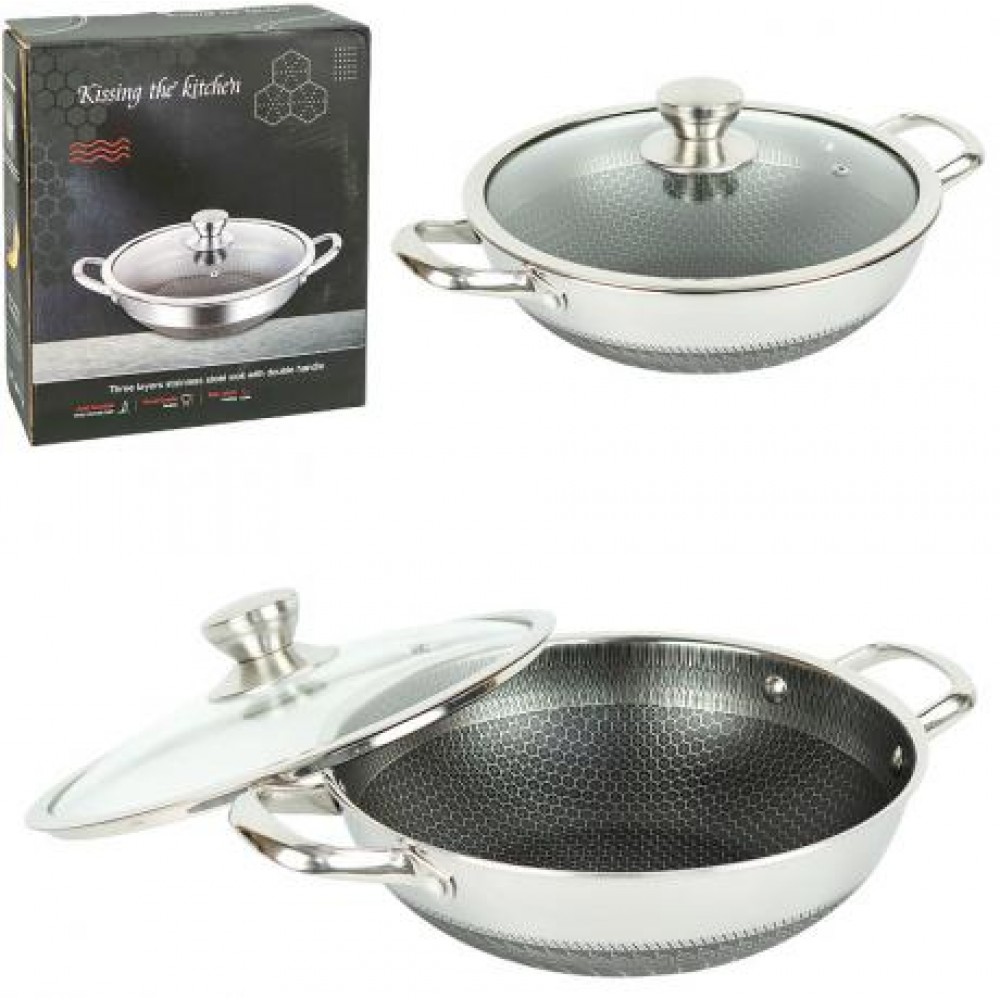 Сковорода-вок з нержавіючої сталі з антипригарним покриттям, 28 см — ідеальний інструмент для приготування смачних страв в азіатському стилі та не тільки. Виготовлена з високоякісної харчової нержавіючої сталі марок 304 і 430, вона має міцні стінки товщиною та інноваційне 6-шарове антипригарне покриття. Спеціальна внутрішня поверхня з сотоподібною текстурою (Honeycomb pattern) забезпечує рівномірне нагрівання та запобігає пригоранню.