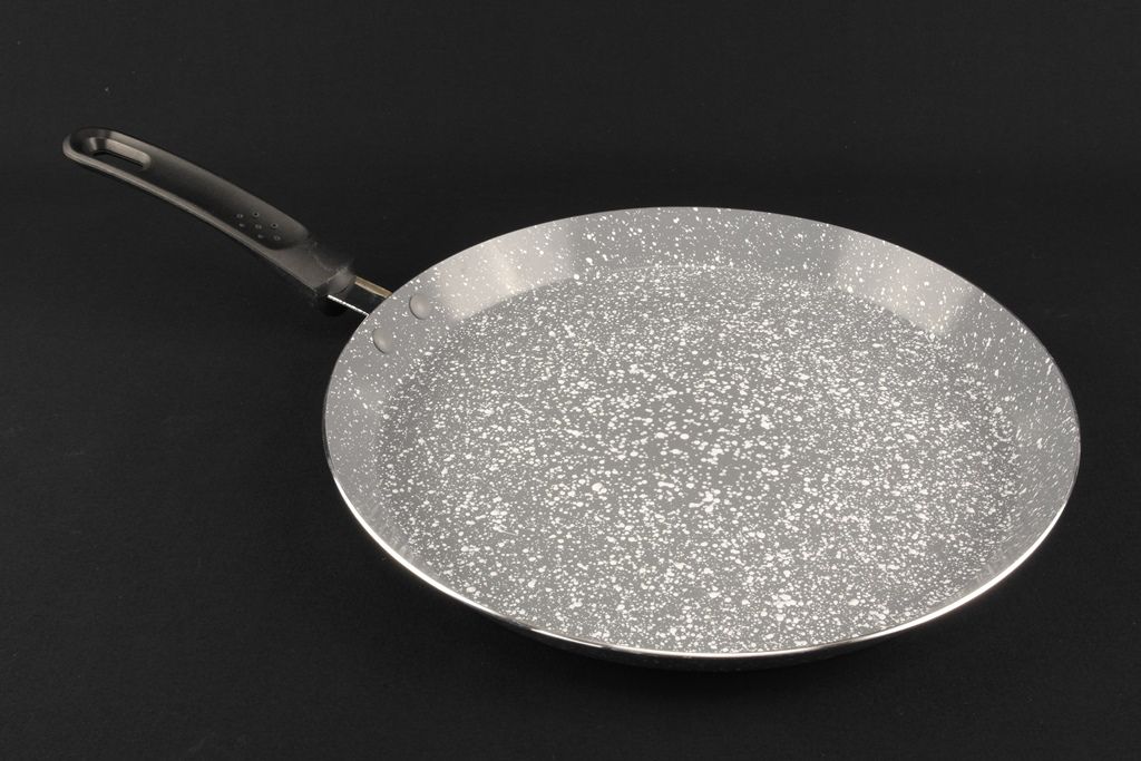 Сковорода изготовлена из качественного алюминия, который характеризуется высокой теплопроводностью и имеет мраморное покрытие – термостойкое и не смачиваемое. Такая поверхность данного товара не содержит вредные вещества и является антипригарной. Мраморное покрытие нанесеное тонким слоем, позволяет значительно улучшить качество приготовленных блинов, омлетов, оладушек практически не используя жиров. Приспособлена для приготовления на всех современных типах плит. С помощью удобной ручки из бакелитового пластика и небольшому весу сковороды, перевернуть блин на другую сторону можно одним движением руки. Ручка не нагревается и не деформируется. Сковорода легко моется в теплой воде с помощью мягкой губки.
