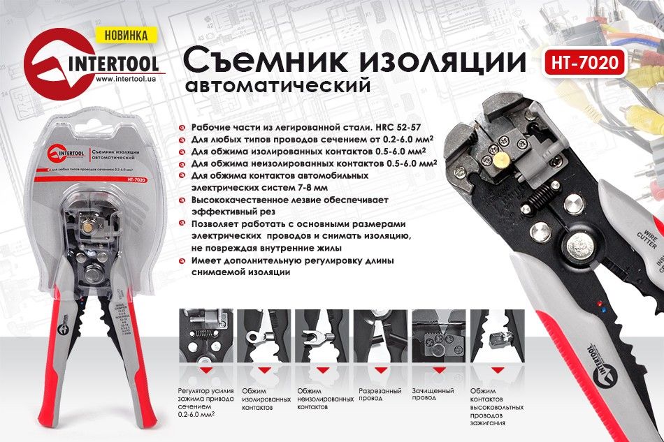 Съемник изоляции автоматический Intertool (Интертул) HT-7020 Универсальный и практичный автоматический съемник изоляции проводов HT-7020. Такой инструмент в руках каждого мастера становится по настоящему мощным оружием против пластиковых оплеток для кабелей. Электромонтажники по достоинству оценят этот съемник для снятия изоляции (стриппер). Стальная конструкция долго прослужит вам верой и правдой, а удобство в работе обеспечивают дополнительные накладки из пластика на рукоятках. С таким инстурментом можно не только снимать изоляцию с проводов, но и перерезать сам провод благодаря острозаточенному прочному лезвию.