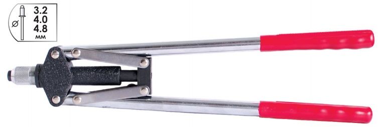 Заклепочник рычажный - профессиональный инструмент, предназначенный для работы с вытяжными алюминиевыми и стальными заклепками диаметром 3,2; 4; 4,8 мм . Изготовлен из высокоачественной стали, обладает высокой прочностью и износостойкостью. Рукоятки инструмента длиной 420 мм оснащены пластиковыми наконечниками, обеспечивающими надежный захват в руке.