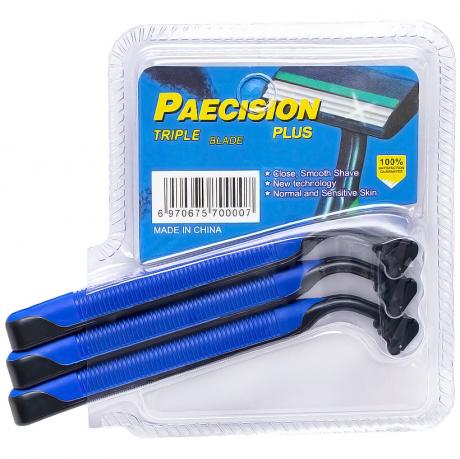 Набір містить три одноразові пластикові бритви з прогумованою ручкою. Бритви оснащені плаваючою голівкою та трьома сталевими лезами. Зволожуюча смужка забезпечує комфорт під час гоління. Упаковка має розміри 9 х 10,5 см. Ціна вказана за весь набір.