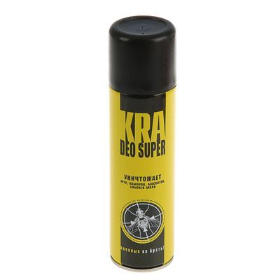 KRA DEO SUPER - инсектицидное аэрозольное средство с характерным запахом, предназначенное для уничтожения мух, комаров, москитов, бабочек моли. Упаковка: баллон 230 мл