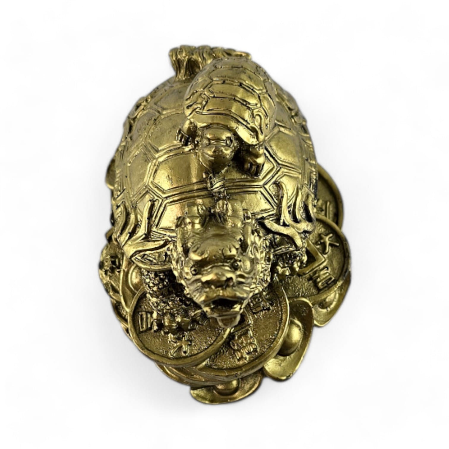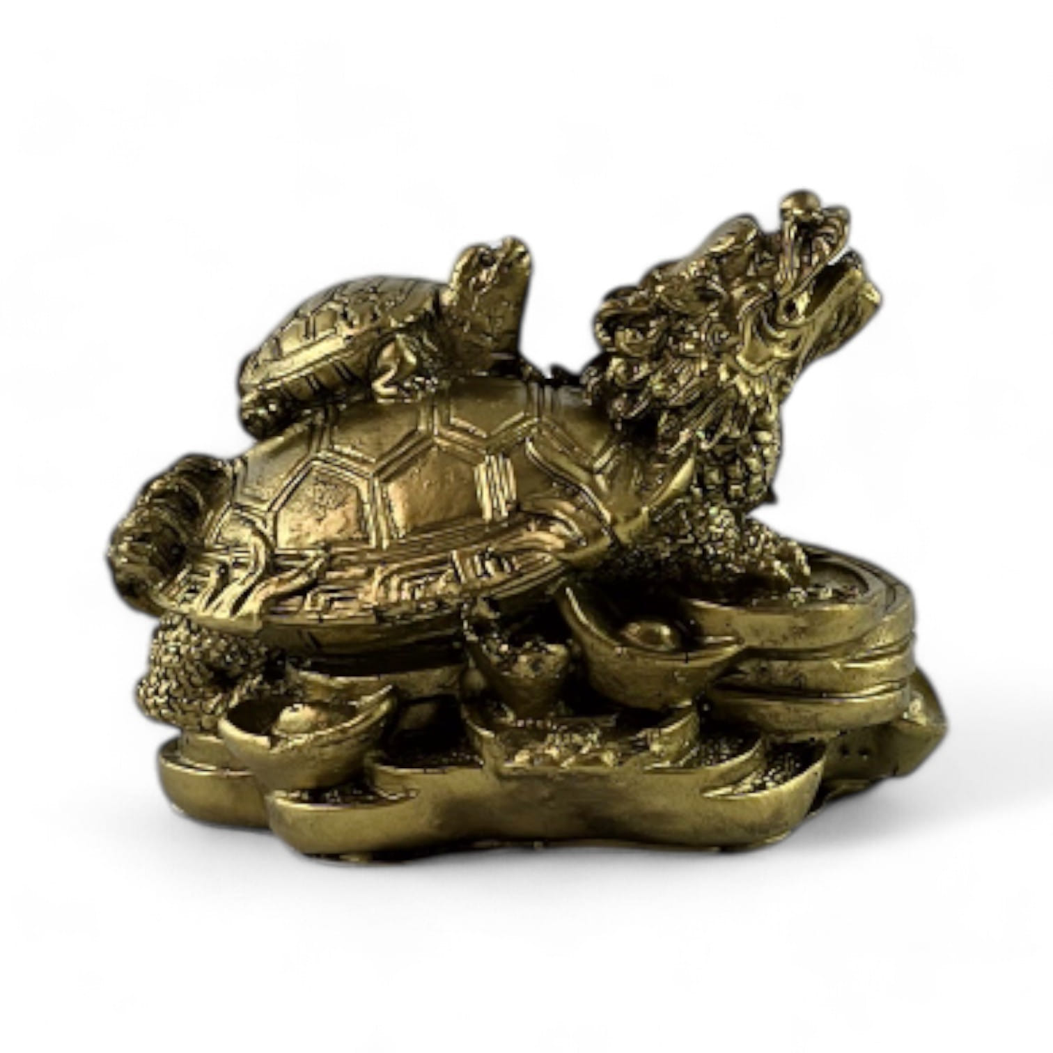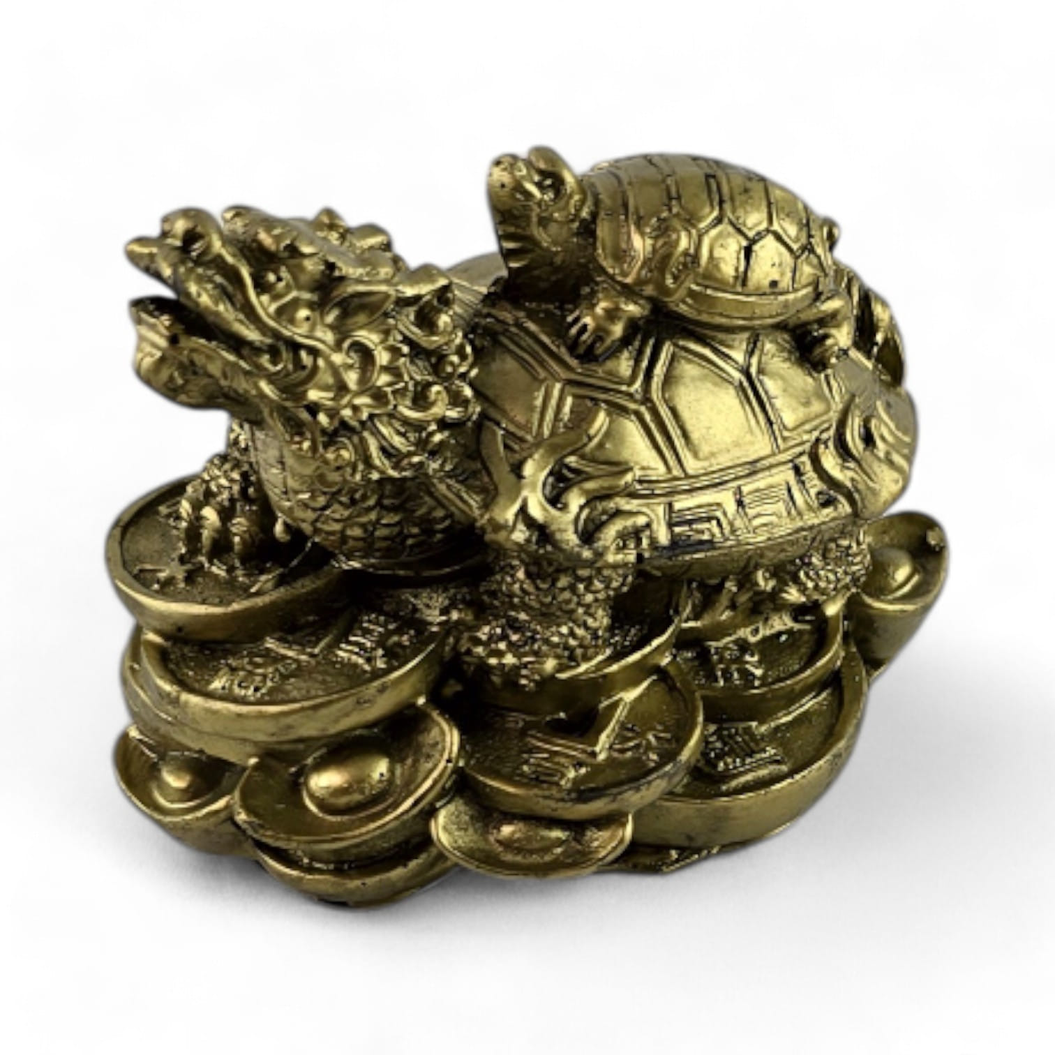 та статуэтка изображает "Биси" — одно из самых известных мифических существ в китайской культуре, сочетающее силу дракона и долголетие черепахи. "Биси" символизирует устойчивость, защиту и процветание. В китайской мифологии Драконовая Черепаха приносит удачу в делах и защищает от негативных энергий.