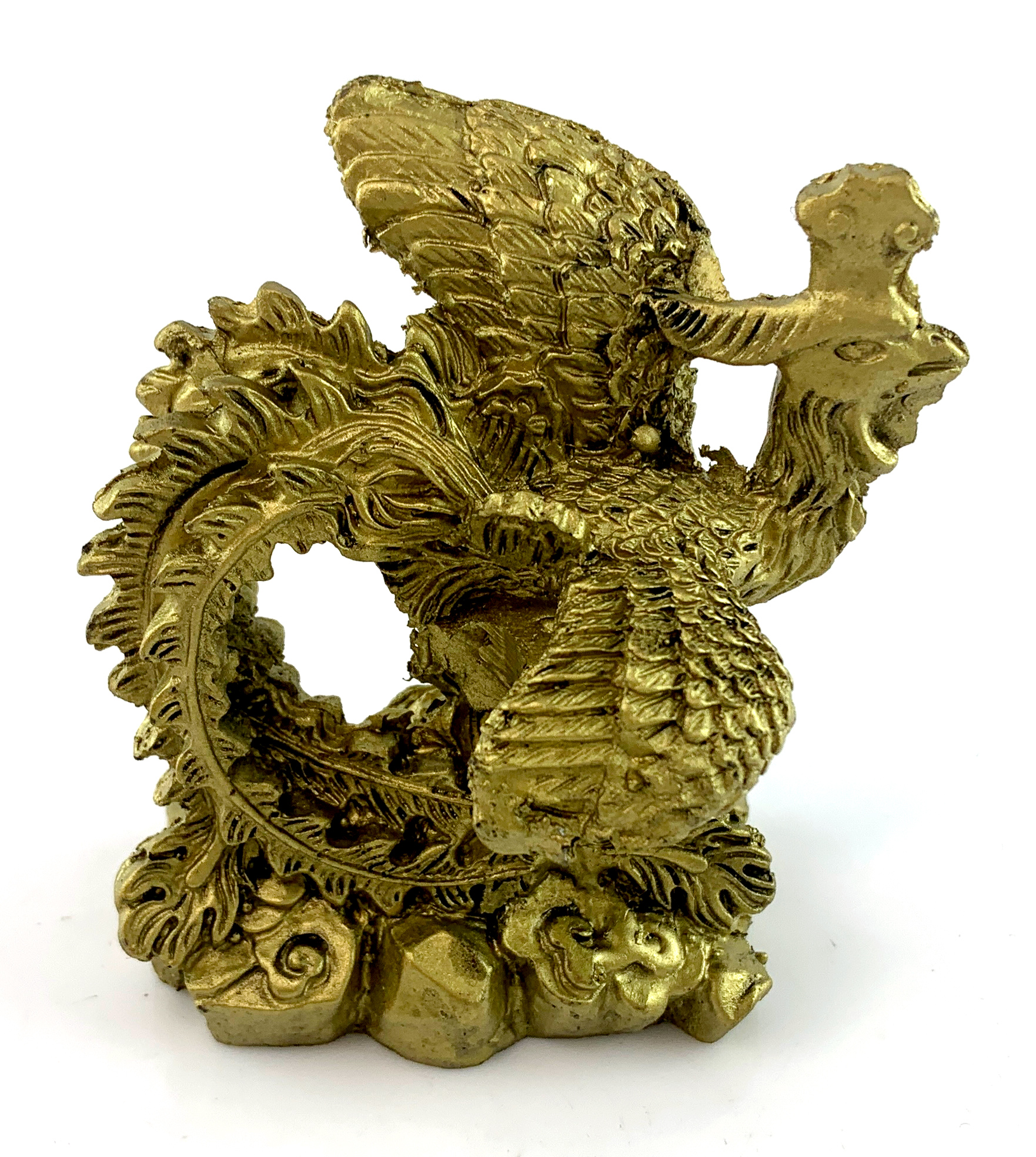 Дракон, своей грозной стойкой фигурой, дополняет грациозность Феникса, который взлетает к новым высотам. Бронзовое покрытие добавляет блеск и визуальный интерес, создавая восхитительное сочетание текстур и цветов.
