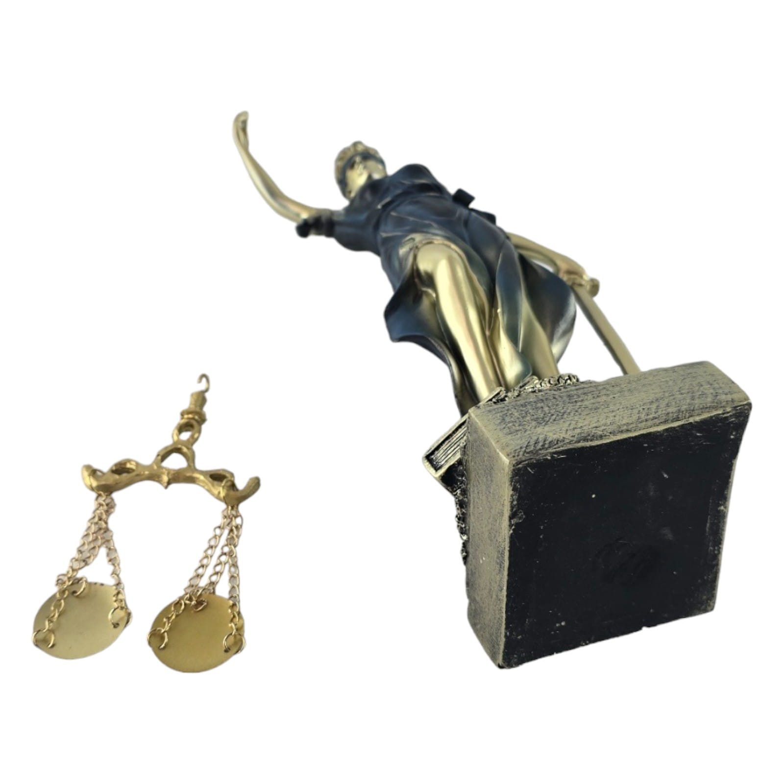Статуэтка стоит на книге, символизируя знание и мудрость.Фемида, стоящая на голове змеи, символизирует победу правосудия над злом или хаосом. Этот образ обычно ассоциируется с идеей справедливости, контролирующей и подавляющей зло.