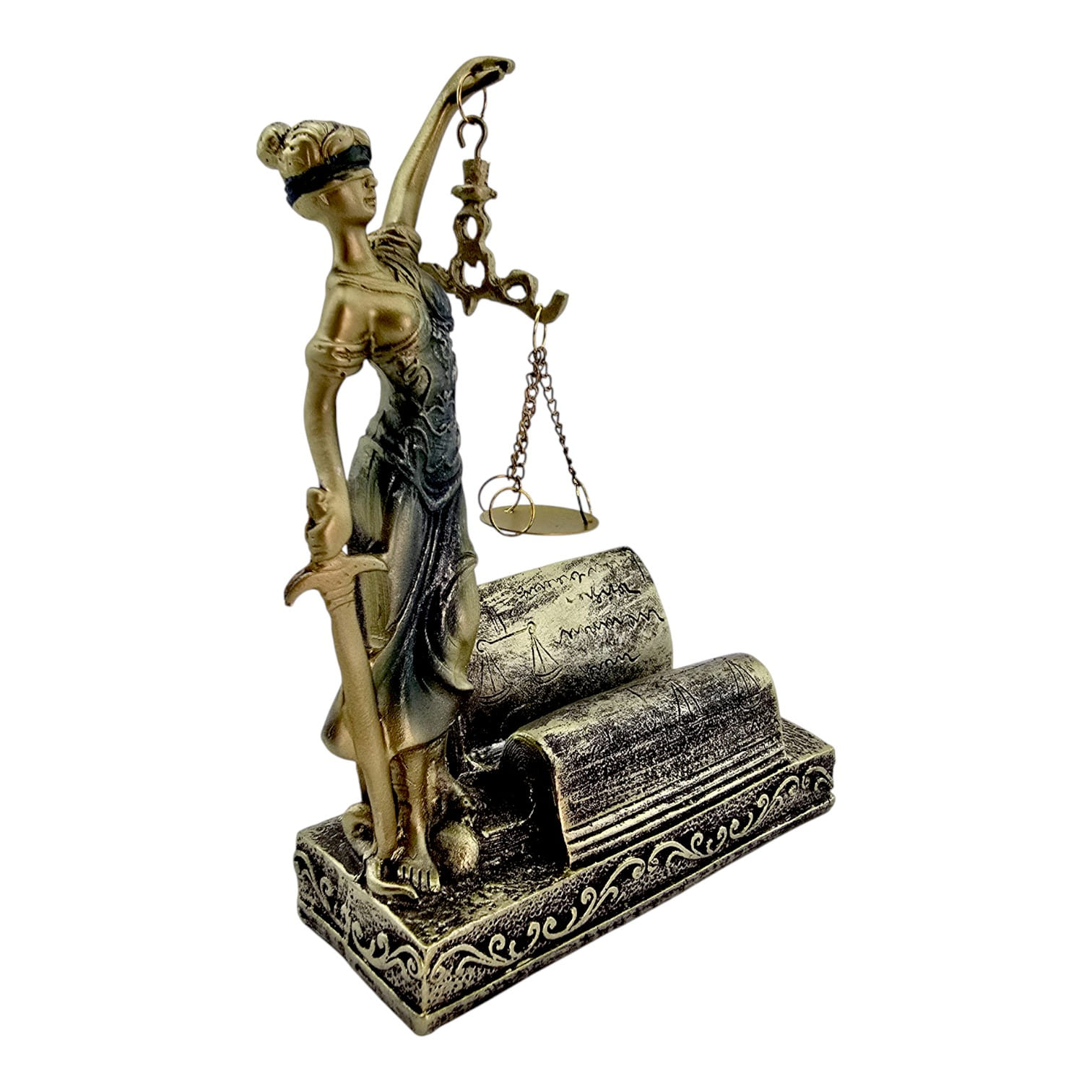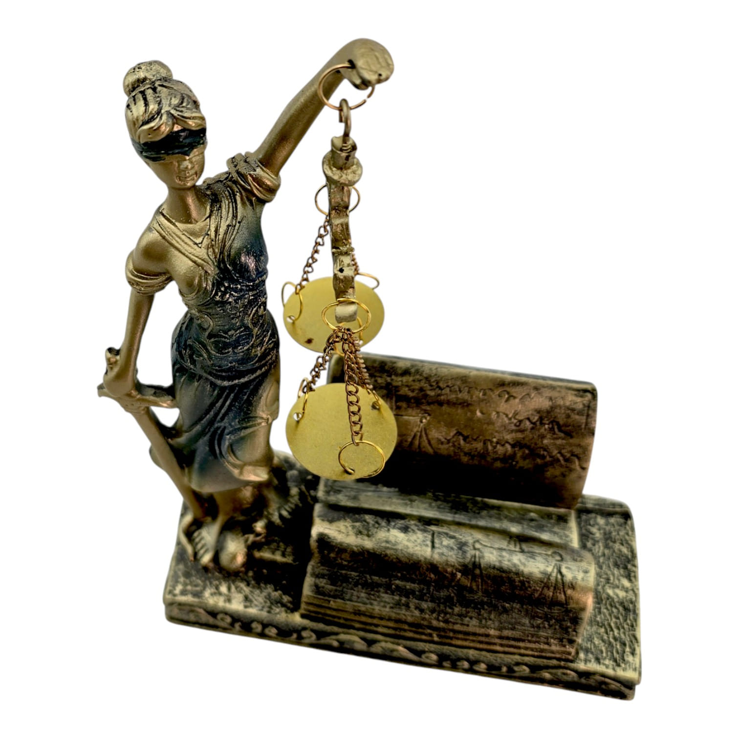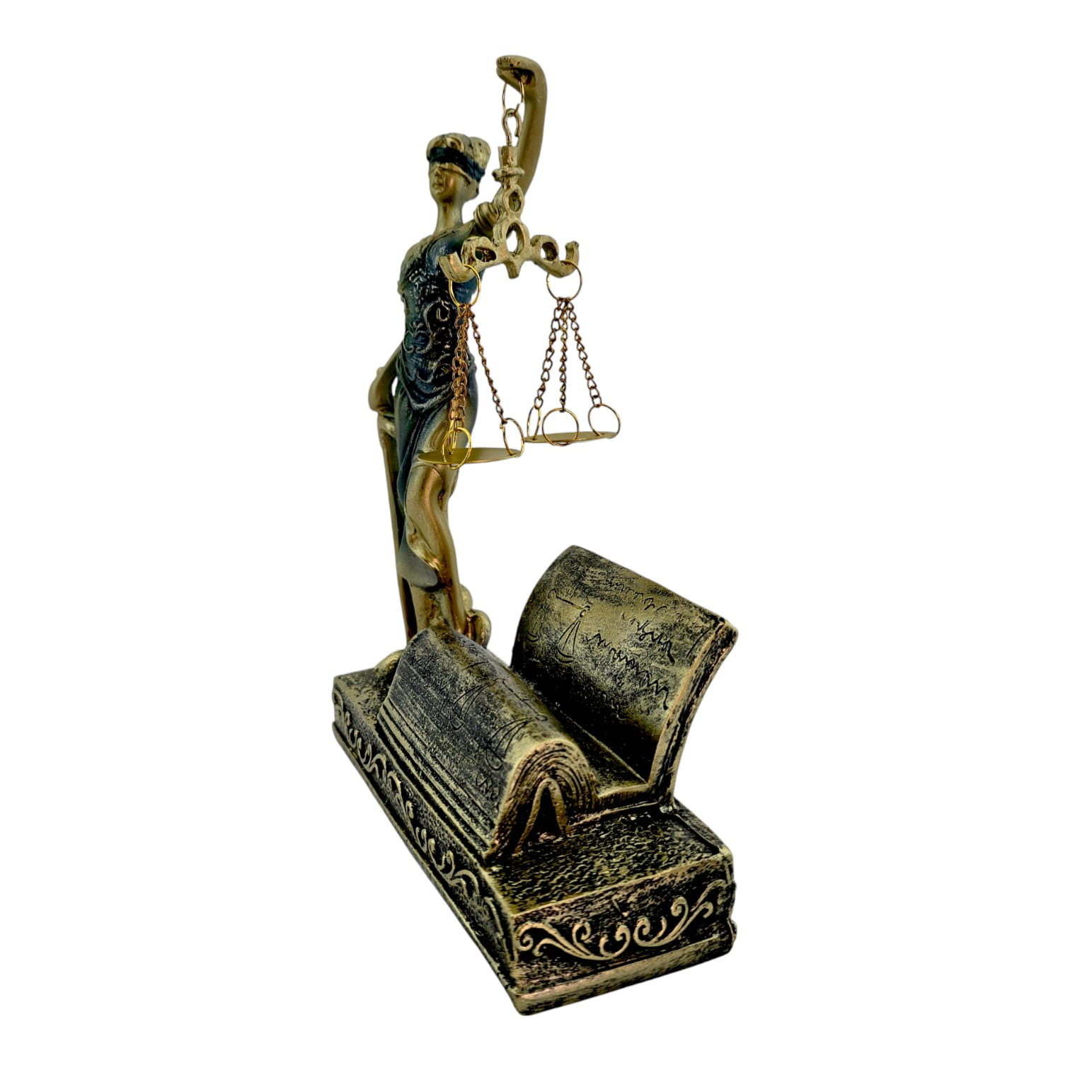 Настольная статуэтка Фемиды с покрытием под бронзу станет выразительным символом справедливости в кабинете юриста, адвоката или судьи. Фигура с мечом и весами на цепочках установлена на декоративных книгах, где удобно размещать визитки. Компактный размер 18 х 13 х 7 см позволяет ставить статуэтку на рабочий стол или полку. Изготовлена из прочного полимера, детали аккуратно проработаны. Отличный подарок для правоведов и деловой декор офиса.
