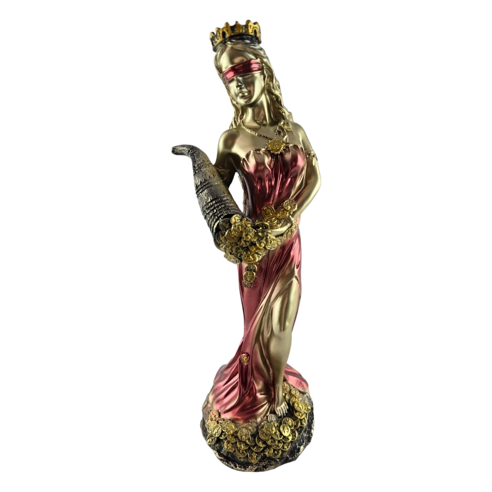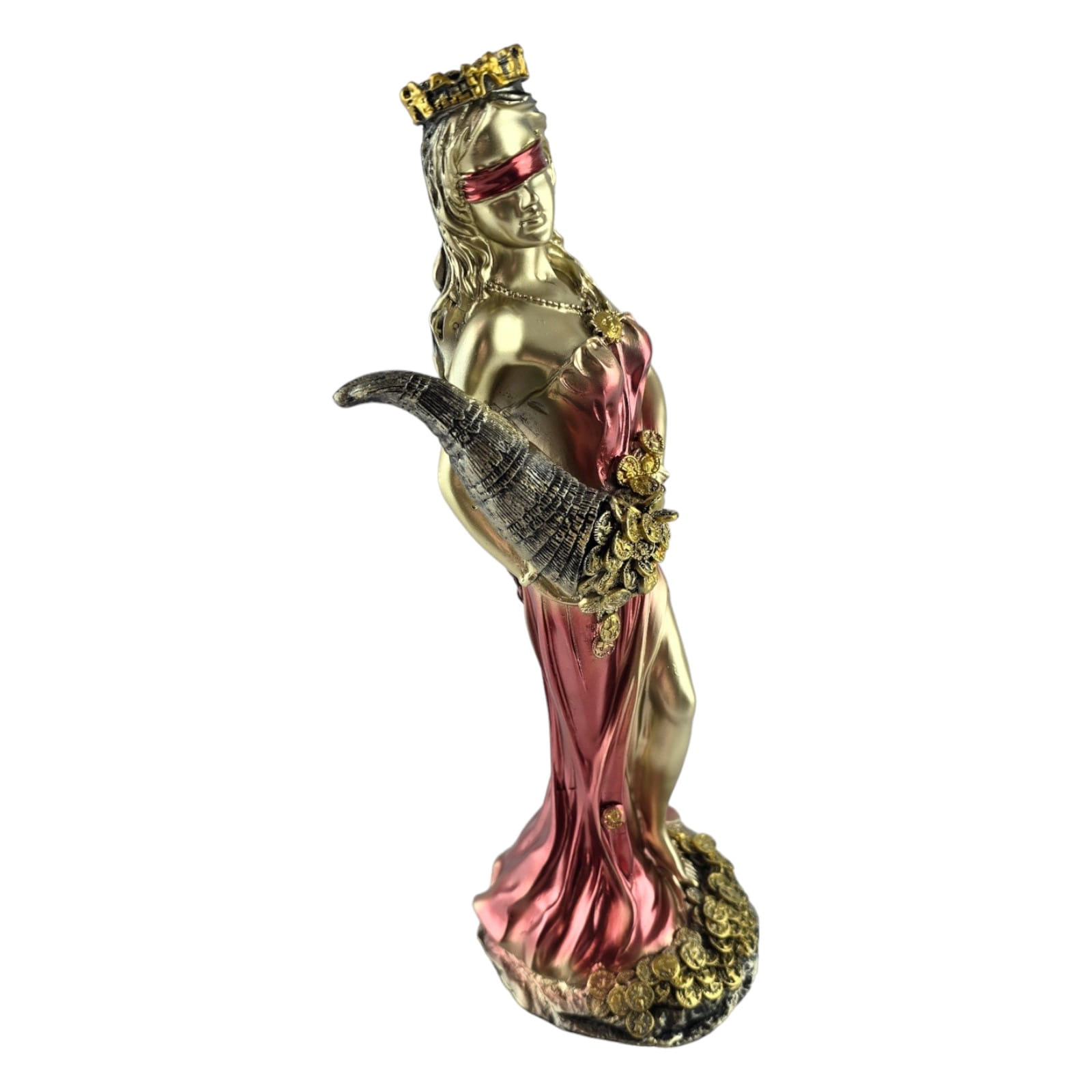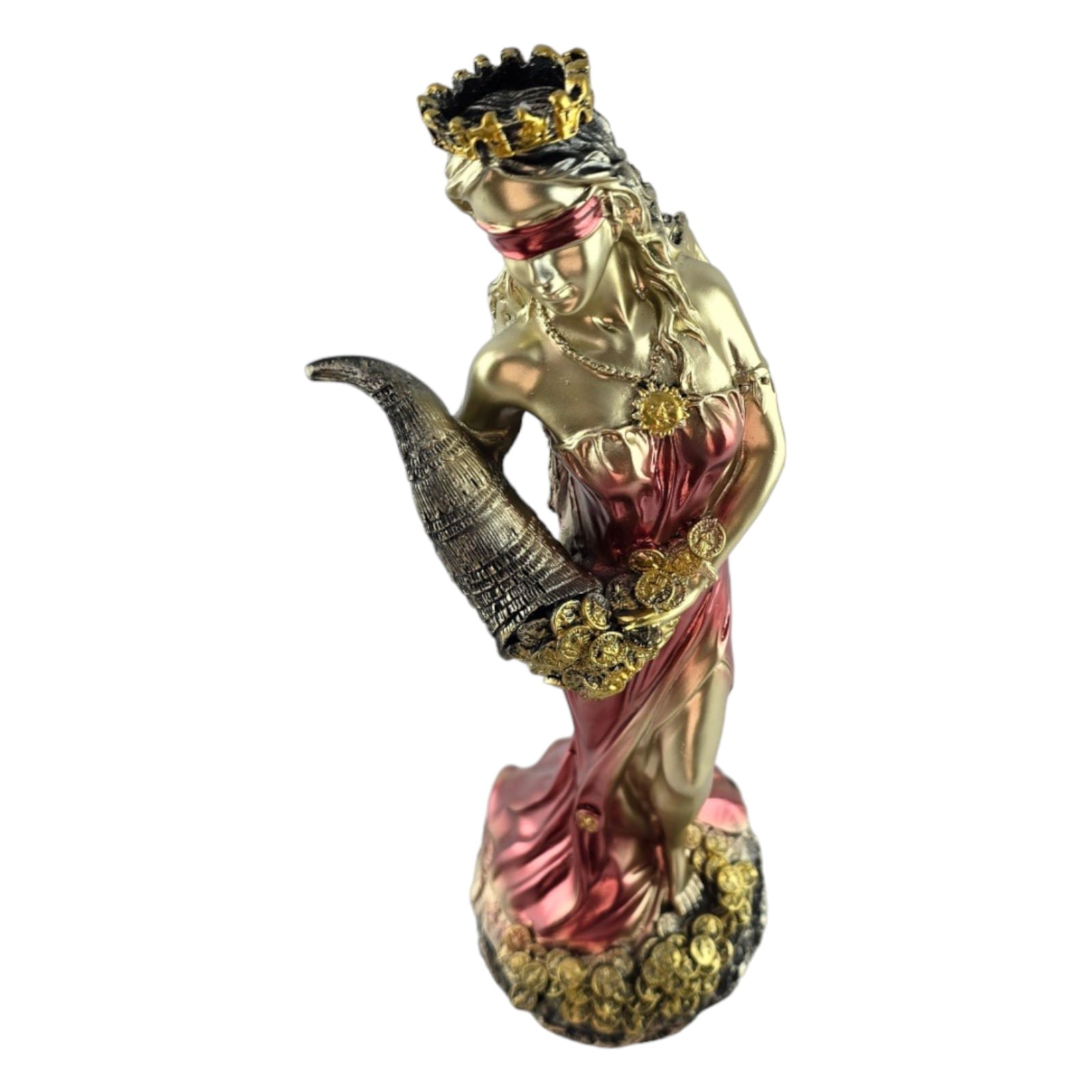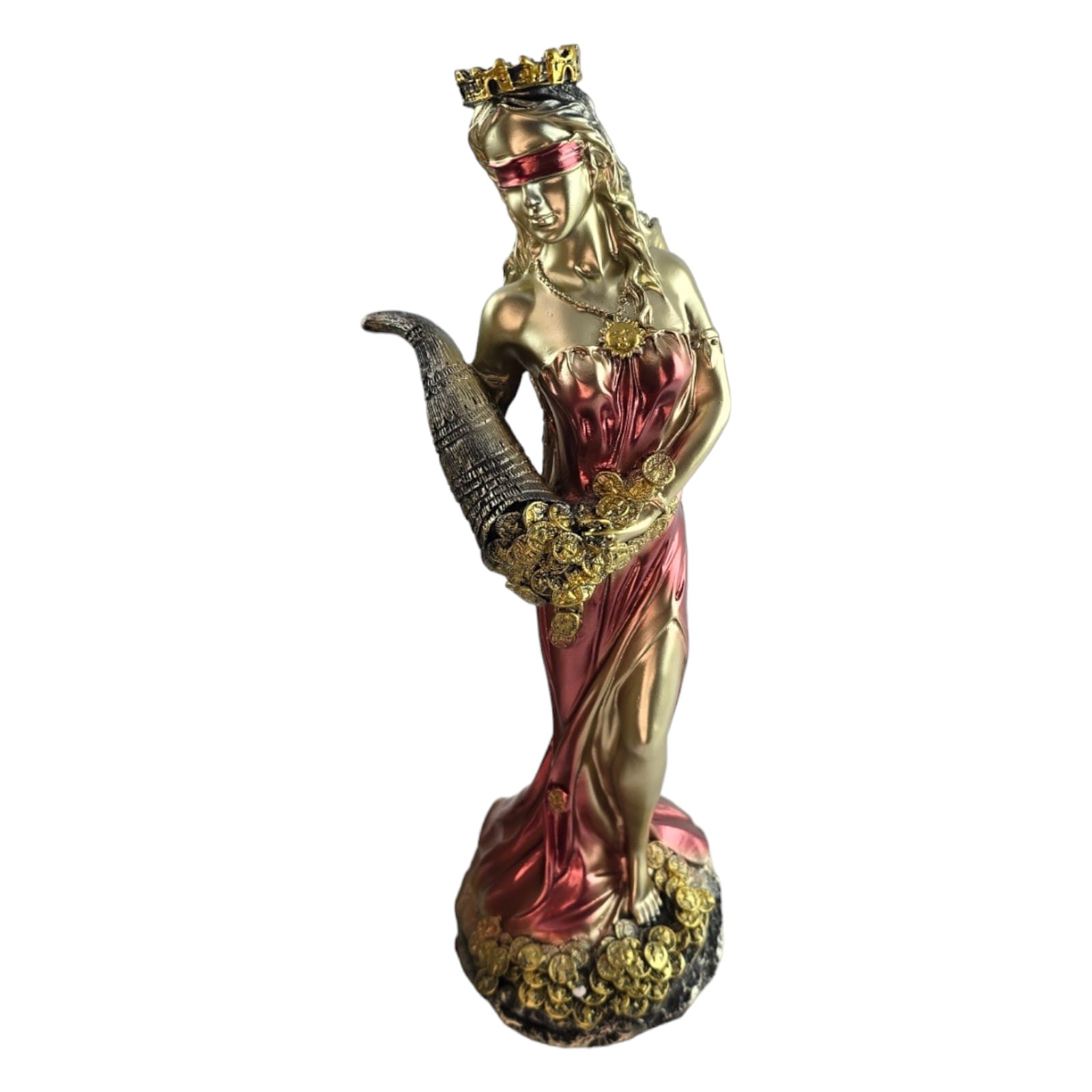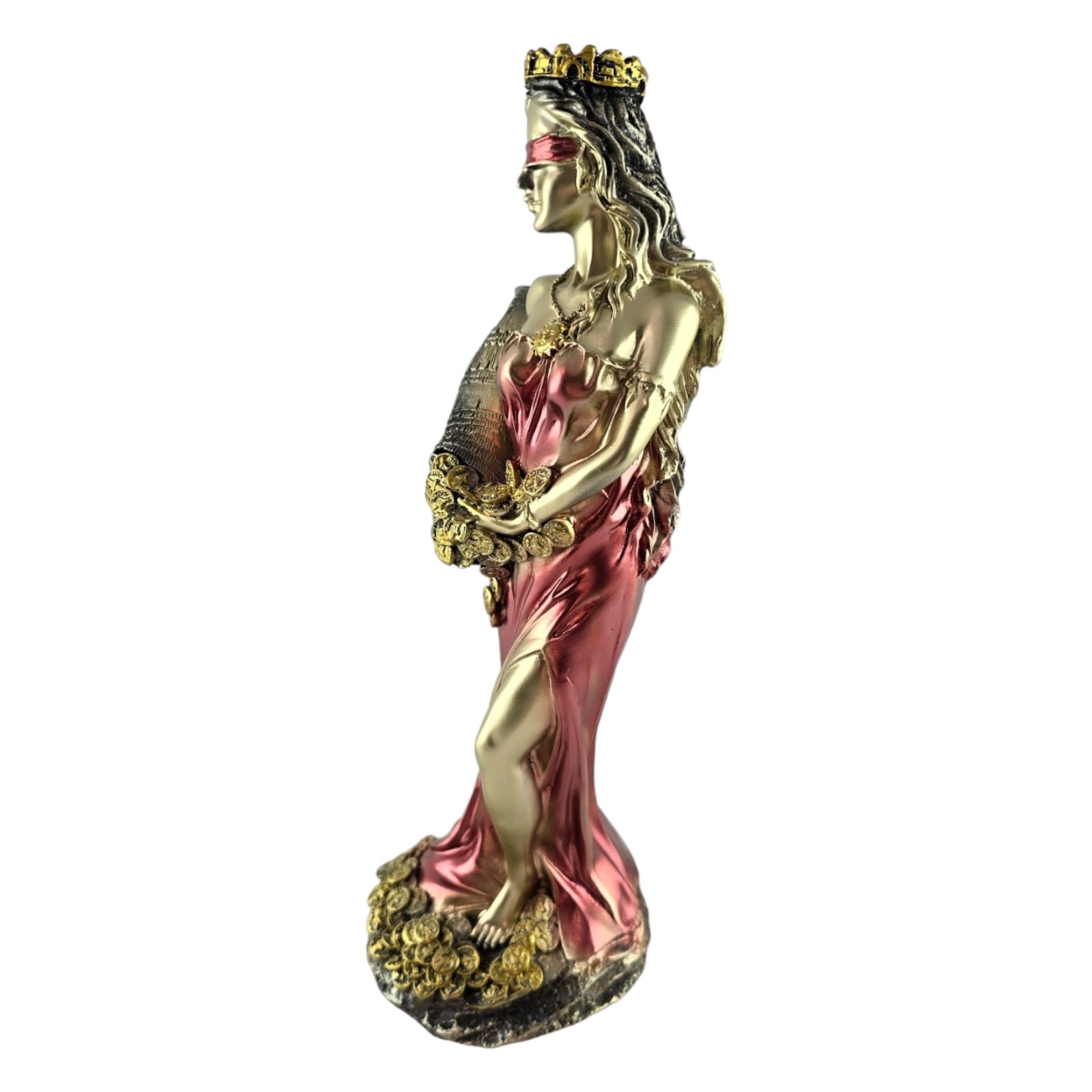 Статуэтка Фортуны излучает элегантность и статусность, воплощая в себе образ богини удачи. В золотистом цвете в белом платье и золотистой повязкой на глазах, она предстает перед вами во всей своей величественной красоте.