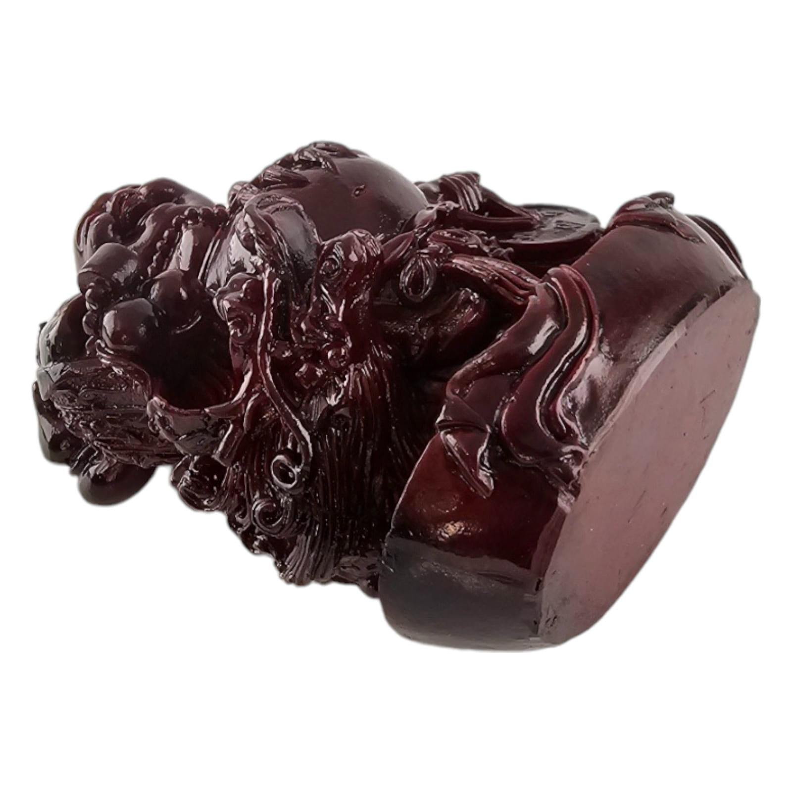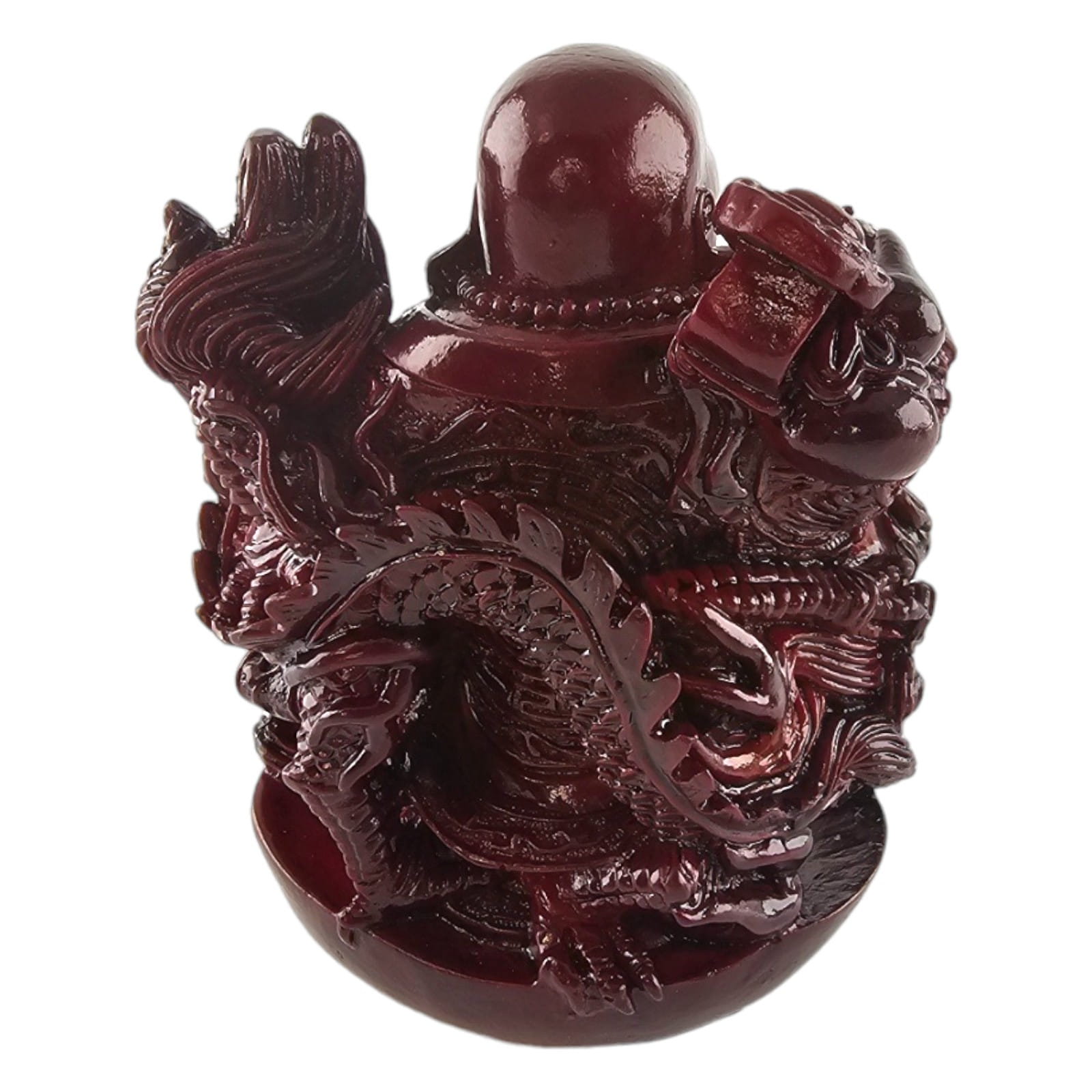 Статуэтка Хотей украшена символическими элементами, такими как монеты, которые символизируют финансовое благополучие, китайский дракон, признак силы и власти, а также тыква-горлянка, символизирующая плодородие и изобилие.