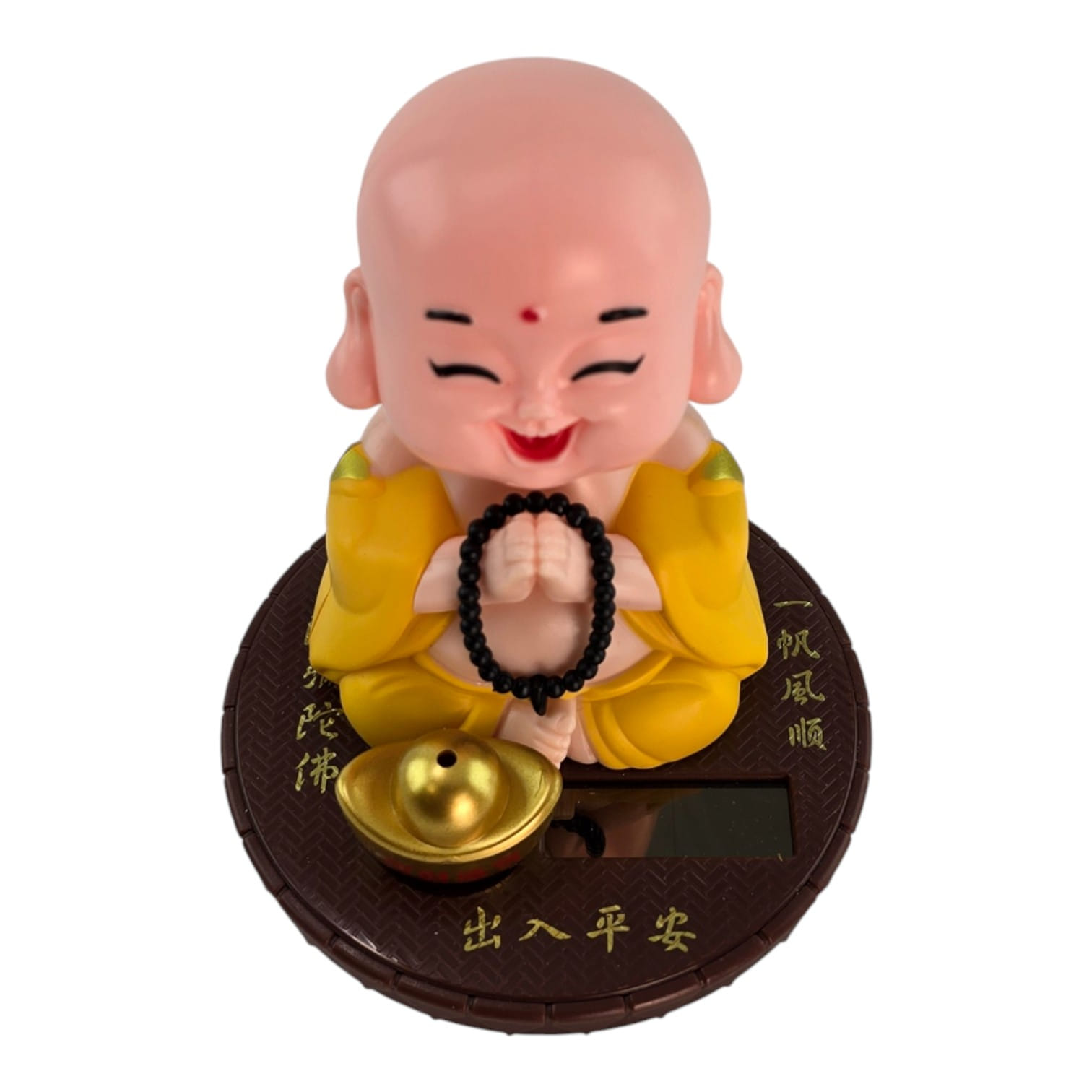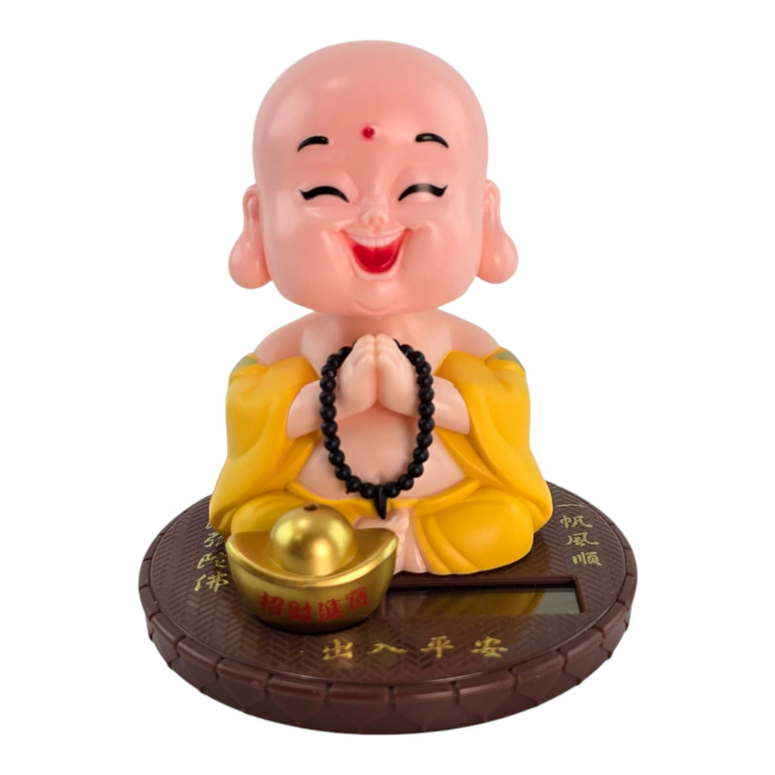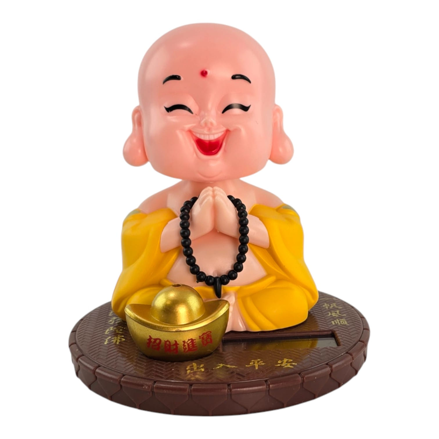 Улыбающийся монах - символ спокойствия, удачи и достатка. В подставку встроена солнечная панель: от дневного/искусственного света маятниковый механизм мягко качает голову (без батареек). Рядом - золотой «юаньбао» как знак благополучия и чётки - символ сосредоточенности. Подходит для панели автомобиля, рабочего стола, ресепшена и дома как талисман и оригинальный подарок.