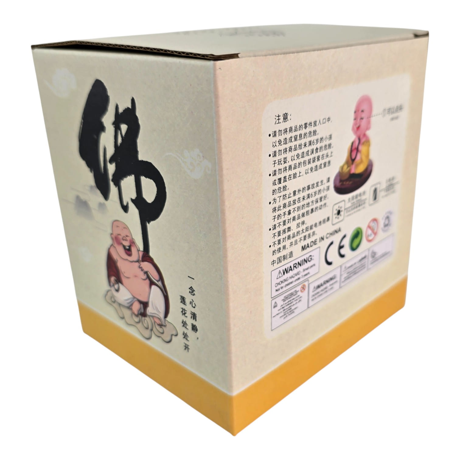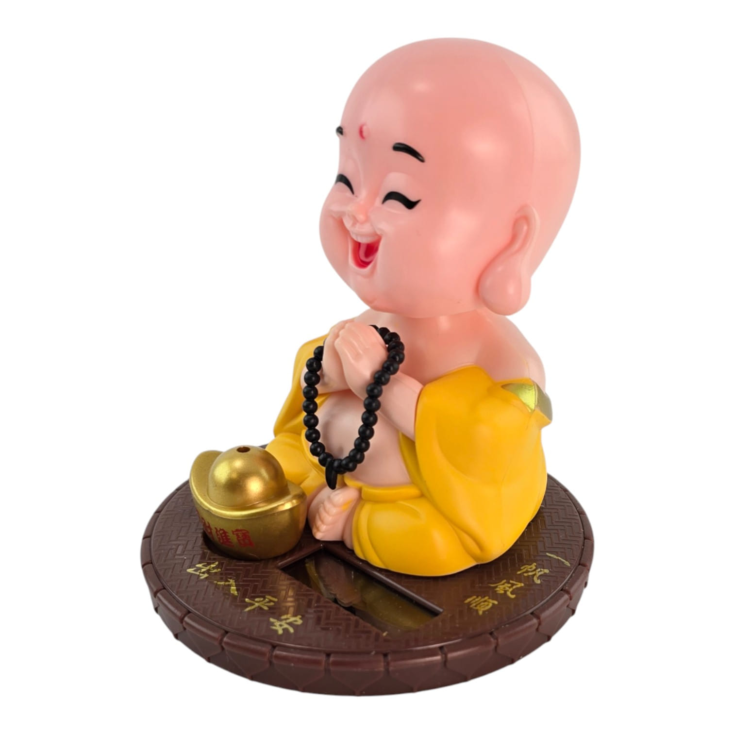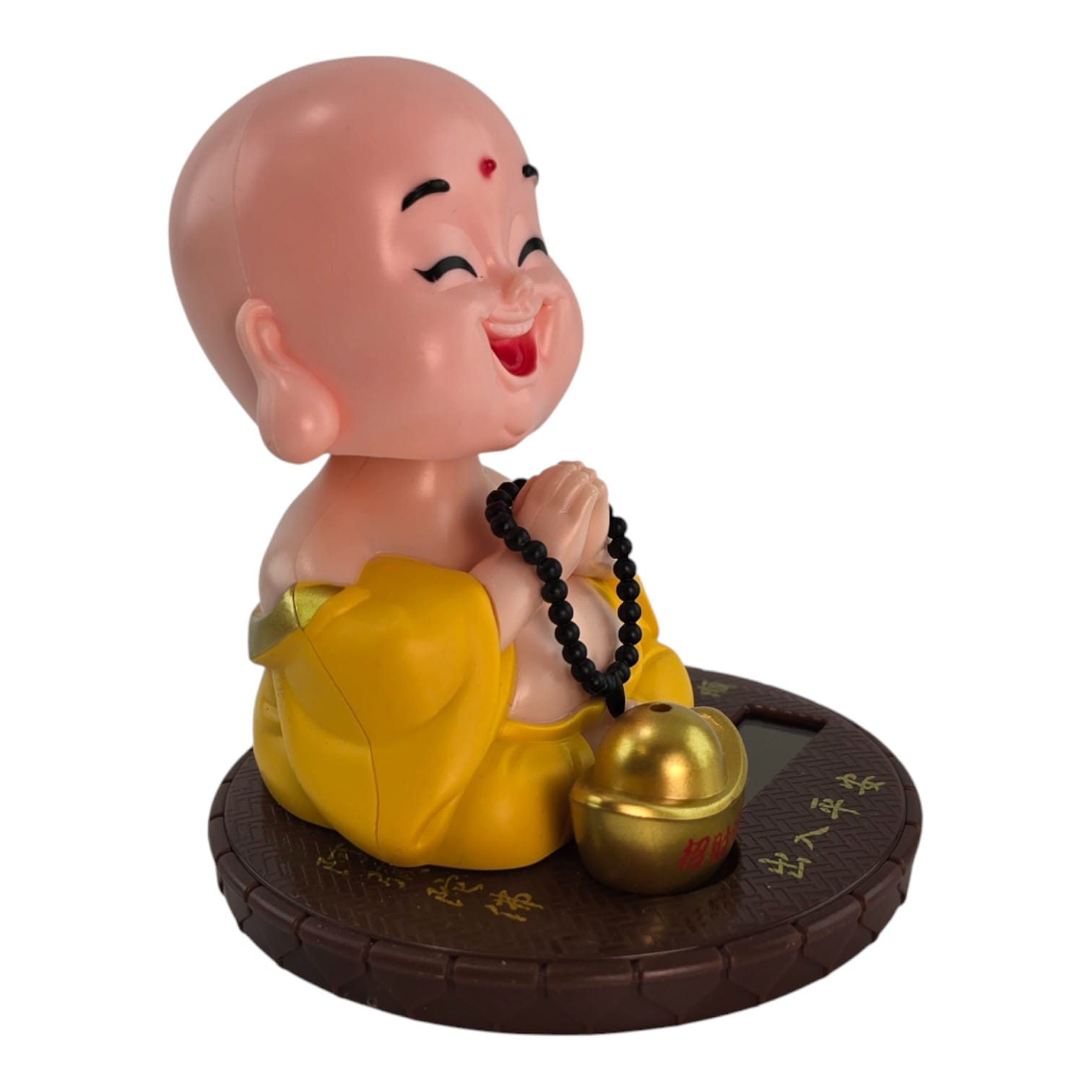 Улыбающийся монах - символ спокойствия, удачи и достатка. В подставку встроена солнечная панель: от дневного/искусственного света маятниковый механизм мягко качает голову (без батареек). Рядом - золотой «юаньбао» как знак благополучия и чётки - символ сосредоточенности. Подходит для панели автомобиля, рабочего стола, ресепшена и дома как талисман и оригинальный подарок.