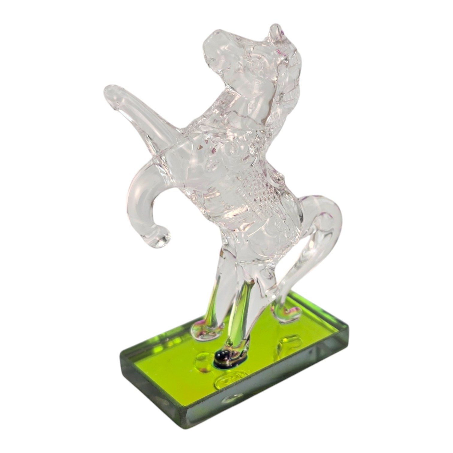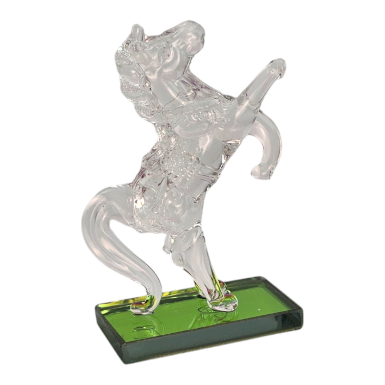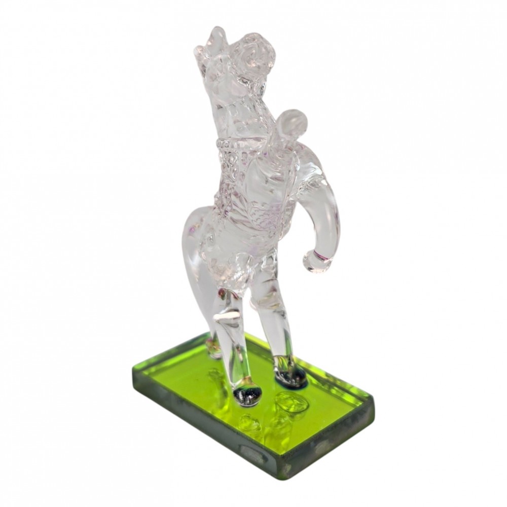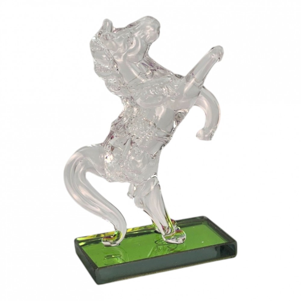 Небольшая кристальная фигурка лошади, вставшей на дыбы, на прямоугольной зеленой подставке. Прозрачное стекло красиво играет на свету, а компактный размер позволяет разместить сувенир на рабочем столе, полке, подоконнике или в витрине. Лошадь ассоциируется с движением вперед, энергией и удачей, поэтому такая фигурка подойдет в подарок коллеге, другу или близкому человеку и станет аккуратным акцентом в интерьере.