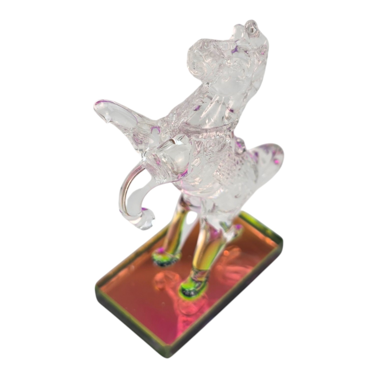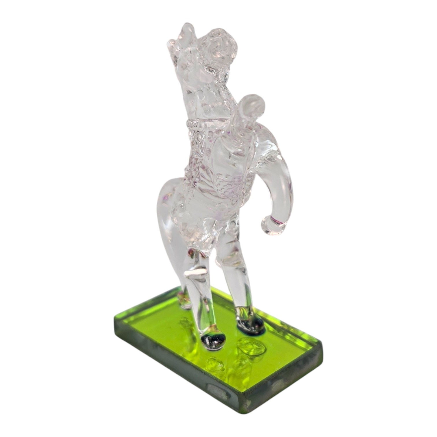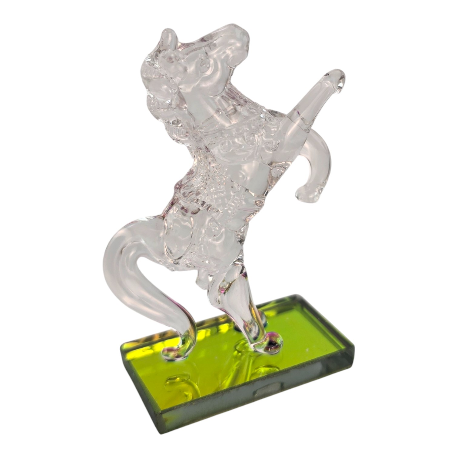 Небольшая кристальная фигурка лошади, вставшей на дыбы, на прямоугольной зеленой подставке. Прозрачное стекло красиво играет на свету, а компактный размер позволяет разместить сувенир на рабочем столе, полке, подоконнике или в витрине. Лошадь ассоциируется с движением вперед, энергией и удачей, поэтому такая фигурка подойдет в подарок коллеге, другу или близкому человеку и станет аккуратным акцентом в интерьере.
